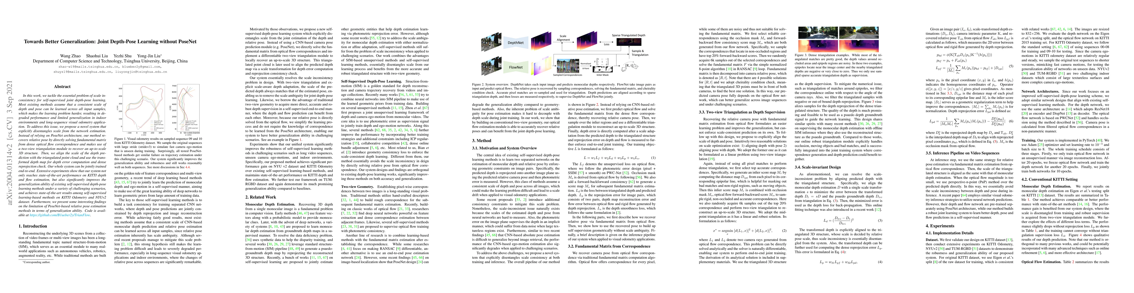 This paper proposes a novel self-supervised joint depth-pose learning system that disentangles scale from network estimation, improving generalization without relying on PoseNet. The method uses fundamental matrix from optical flow and a two-view triangulation module to recover an up-to-scale 3D structure, achieving state-of-the-art results on KITTI and NYUv2 datasets.