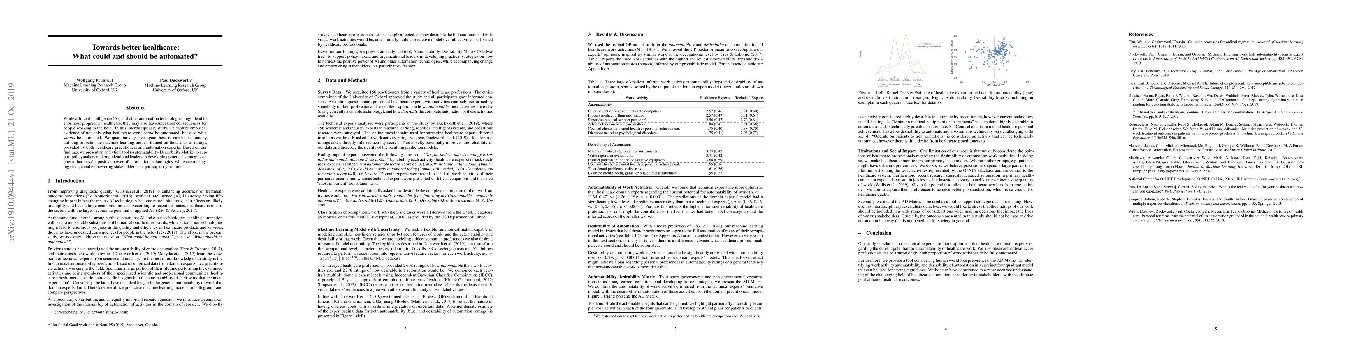 While artificial intelligence (AI) and other automation technologies might lead to enormous progress in healthcare, they may also have undesired consequences for people working in the field. In this interdisciplinary study, we capture empirical evidence of not only what healthcare work could be automated, but also what should be automated. We quantitatively investigate these research questions by utilizing probabilistic machine learning models trained on thousands of ratings, provided by both healthcare practitioners and automation experts. Based on our findings, we present an analytical tool (Automatability-Desirability Matrix) to support policymakers and organizational leaders in developing practical strategies on how to harness the positive power of automation technologies, while accompanying change and empowering stakeholders in a participatory fashion.