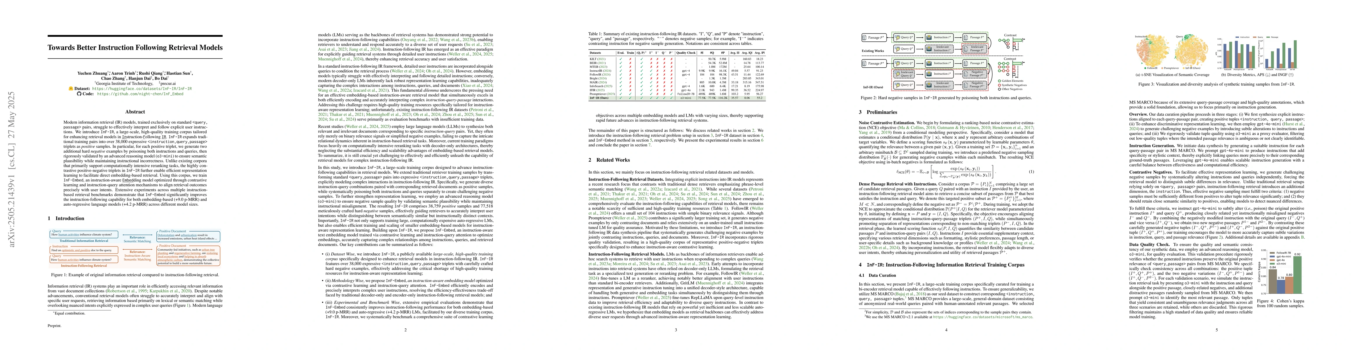 The research introduces InF-IR, a large-scale, high-quality training corpus with over 38,000 <instruction, query, passage> triplets, including positive samples and hard negative examples validated by an advanced reasoning model (o3-mini). It also presents InF-Embed, an instruction-aware embedding model trained with contrastive learning and instruction-query attention mechanisms.