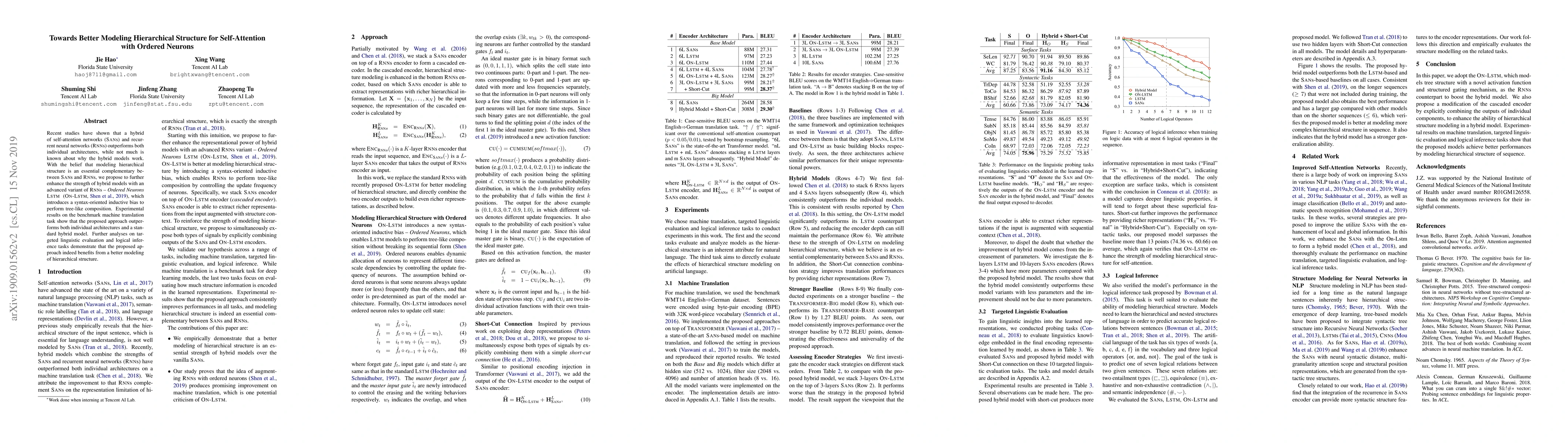 This paper proposes an Ordered Neurons LSTM (ON-LSTM) to enhance hybrid self-attention networks (SANs) and recurrent neural networks (RNNs) by modeling hierarchical structures. Experimental results show improved performance on machine translation tasks, indicating better modeling of hierarchical structures.