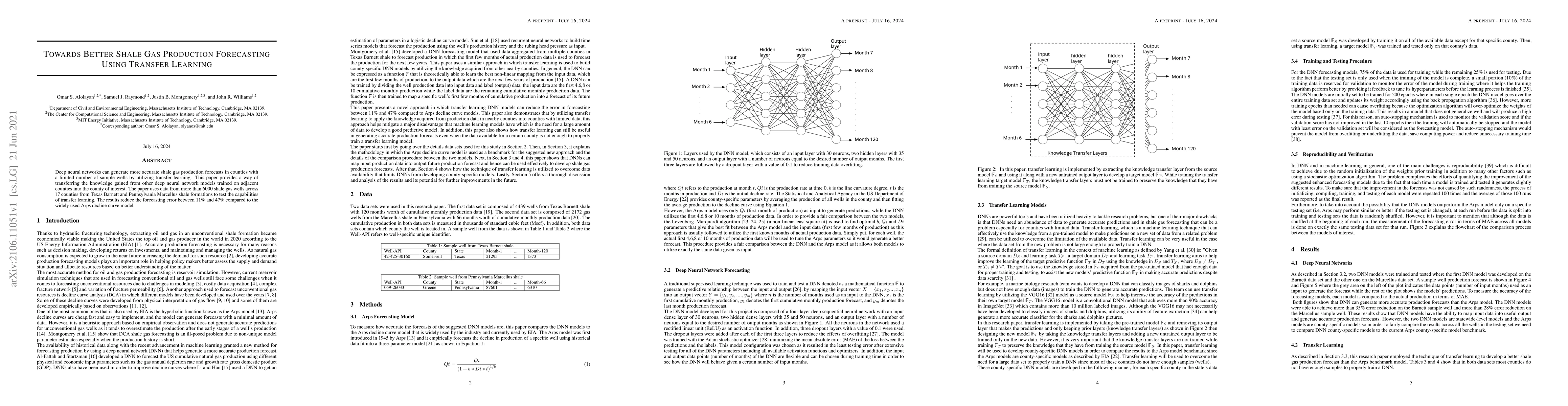 Deep neural networks can generate more accurate shale gas production forecasts in counties with a limited number of sample wells by utilizing transfer learning. This paper provides a way of transferring the knowledge gained from other deep neural network models trained on adjacent counties into the county of interest. The paper uses data from more than 6000 shale gas wells across 17 counties from Texas Barnett and Pennsylvania Marcellus shale formations to test the capabilities of transfer learning. The results reduce the forecasting error between 11% and 47% compared to the widely used Arps decline curve model.