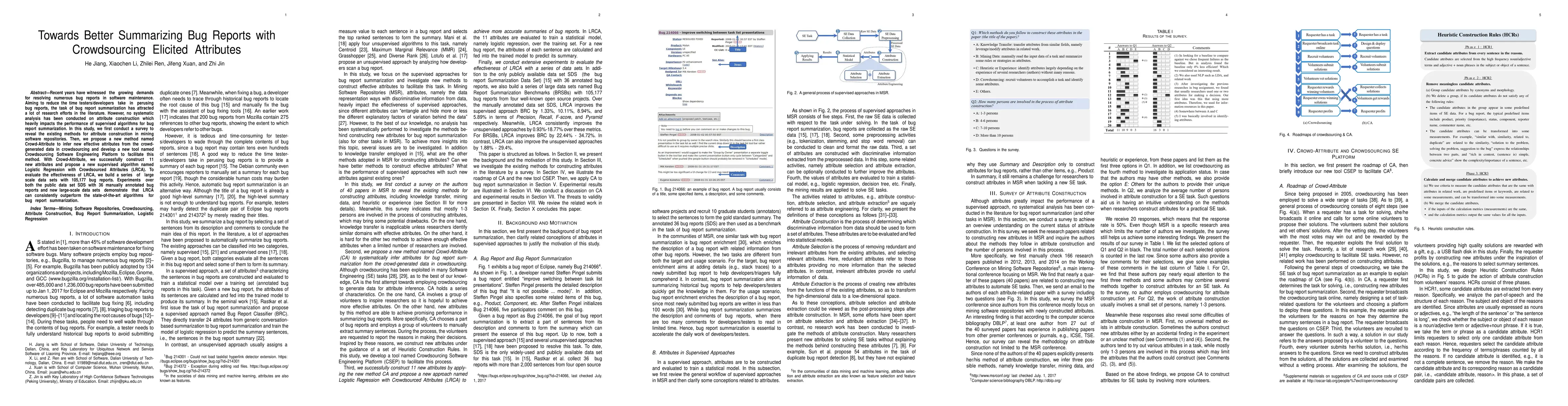Recent years have witnessed the growing demands for resolving numerous bug reports in software maintenance. Aiming to reduce the time testers/developers take in perusing bug reports, the task of bug report summarization has attracted a lot of research efforts in the literature. However, no systematic analysis has been conducted on attribute construction which heavily impacts the performance of supervised algorithms for bug report summarization. In this study, we first conduct a survey to reveal the existing methods for attribute construction in mining software repositories. Then, we propose a new method named Crowd-Attribute to infer new effective attributes from the crowdgenerated data in crowdsourcing and develop a new tool named Crowdsourcing Software Engineering Platform to facilitate this method. With Crowd-Attribute, we successfully construct 11 new attributes and propose a new supervised algorithm named Logistic Regression with Crowdsourced Attributes (LRCA). To evaluate the effectiveness of LRCA, we build a series of large scale data sets with 105,177 bug reports. Experiments over both the public data set SDS with 36 manually annotated bug reports and new large-scale data sets demonstrate that LRCA can consistently outperform the state-of-the-art algorithms for bug report summarization.