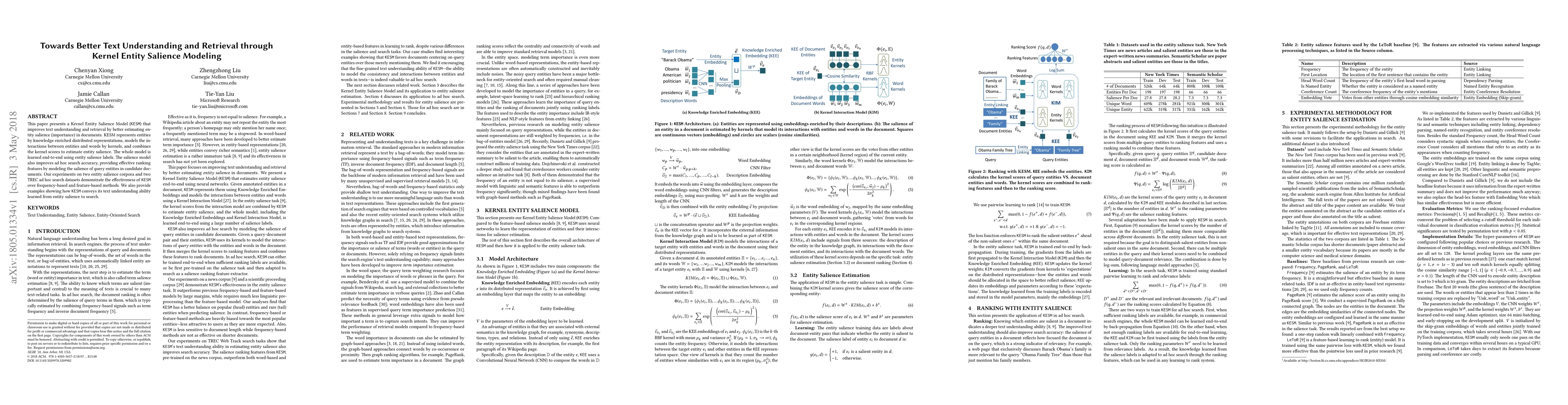 This paper introduces a Kernel Entity Salience Model (KESM) that enhances text understanding and retrieval by accurately estimating entity importance in documents, improving search accuracy through effective ranking features. Experiments show KESM outperforms traditional methods on entity salience and TREC search datasets.
