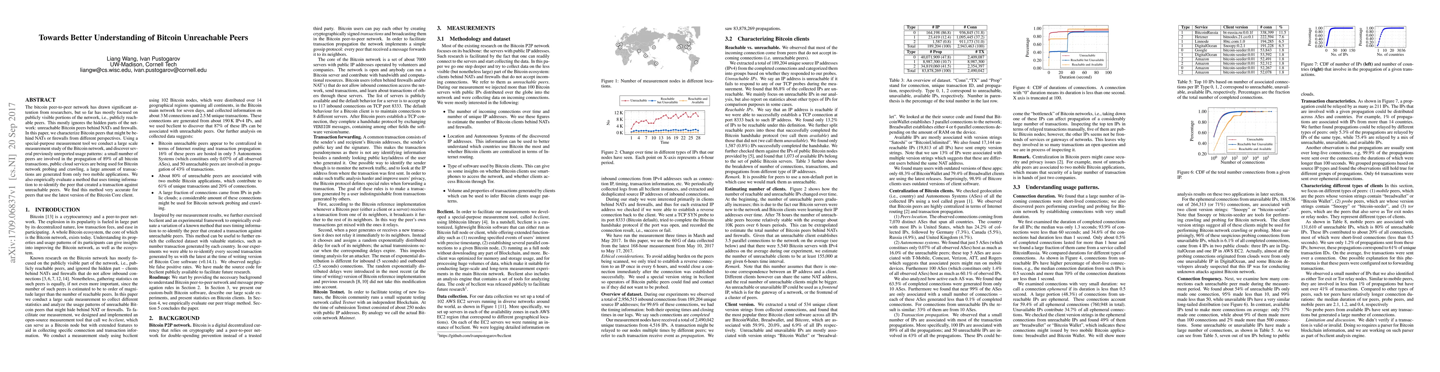 A large-scale measurement study of Bitcoin reveals hidden usage patterns behind NATs and firewalls, including a small number of peers responsible for 89% of transactions and cloud services used for network probing.
