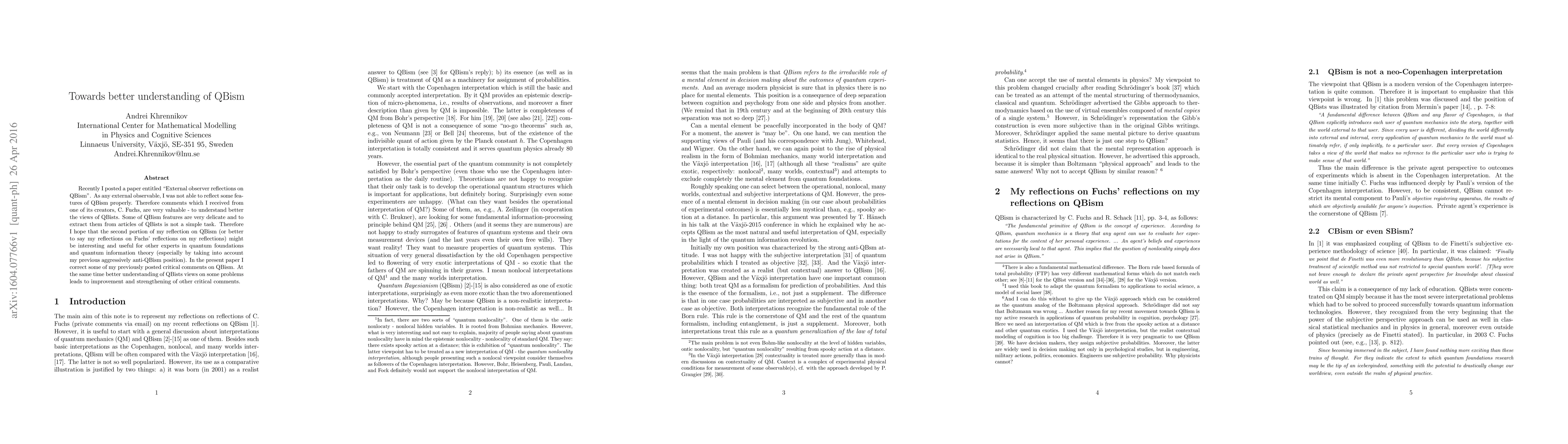 Recently I posted a paper entitled "External observer reflections on QBism". As any external observable, I was not able to reflect some features of QBism properly. Therefore comments which I received from one of its creators, C. Fuchs, are very valuable - to understand better the views of QBists. Some of QBism features are very delicate and to extract them from articles of QBists is not a simple task. Therefore I hope that the second portion of my reflection on QBism (or better to say my reflections on Fuchs' reflections on my reflections) might be interesting and useful for other experts in quantum foundations and quantum information theory (especially by taking into account my previous aggressively anti-QBism position). In the present paper I correct some of my previously posted critical comments on QBism. At the same time better understanding of QBists views on some problems leads to improvement and strengthening of other critical comments.