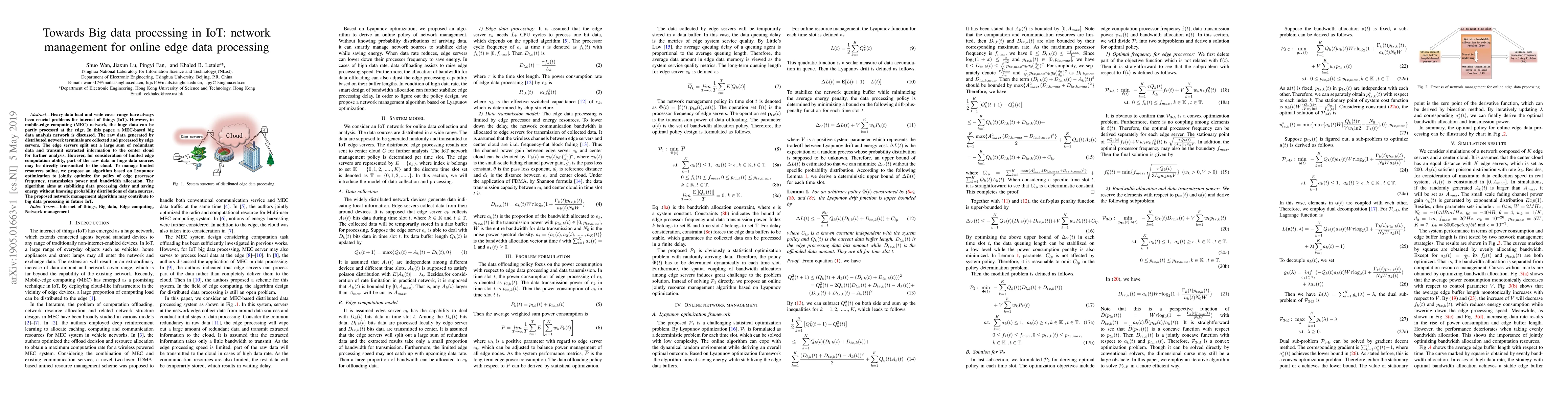 This paper proposes a mobile-edge computing (MEC) based network for managing big data in IoT, optimizing edge processor frequency, transmission power, and bandwidth allocation using a Lyapunov optimization algorithm to stabilize data processing delay and save energy. The approach aims to enhance future IoT big data processing efficiency by leveraging edge servers to handle large data loads.