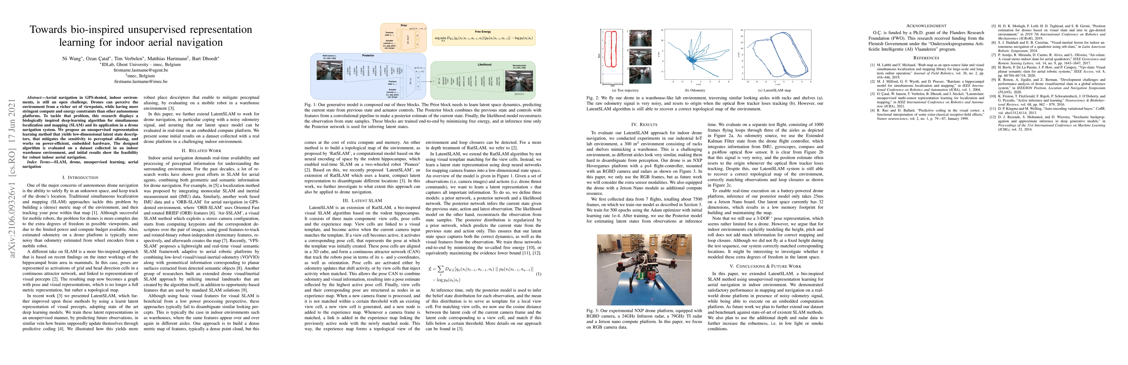 Aerial navigation in GPS-denied, indoor environments, is still an open challenge. Drones can perceive the environment from a richer set of viewpoints, while having more stringent compute and energy constraints than other autonomous platforms. To tackle that problem, this research displays a biologically inspired deep-learning algorithm for simultaneous localization and mapping (SLAM) and its application in a drone navigation system. We propose an unsupervised representation learning method that yields low-dimensional latent state descriptors, that mitigates the sensitivity to perceptual aliasing, and works on power-efficient, embedded hardware. The designed algorithm is evaluated on a dataset collected in an indoor warehouse environment, and initial results show the feasibility for robust indoor aerial navigation.