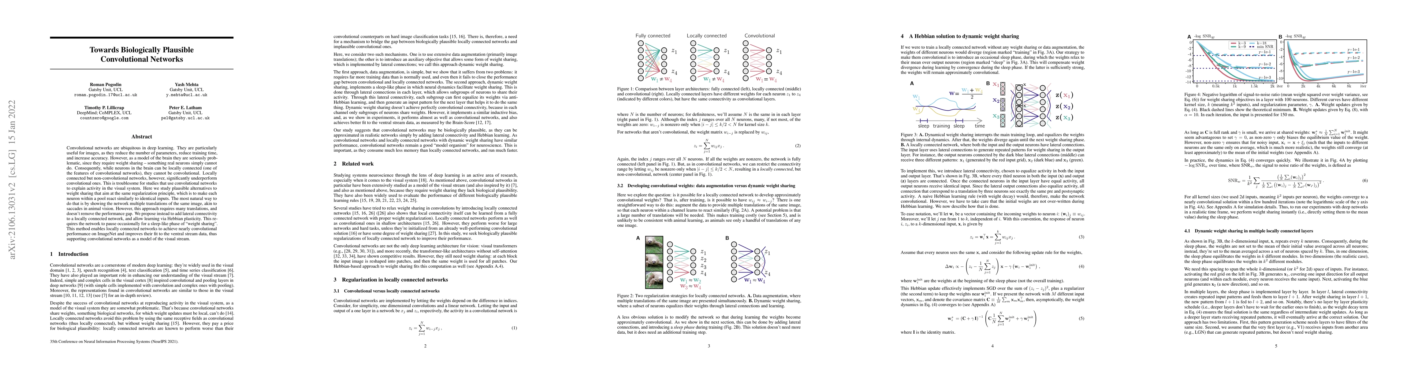 Convolutional networks are ubiquitous in deep learning. They are particularly useful for images, as they reduce the number of parameters, reduce training time, and increase accuracy. However, as a model of the brain they are seriously problematic, since they require weight sharing - something real neurons simply cannot do. Consequently, while neurons in the brain can be locally connected (one of the features of convolutional networks), they cannot be convolutional. Locally connected but non-convolutional networks, however, significantly underperform convolutional ones. This is troublesome for studies that use convolutional networks to explain activity in the visual system. Here we study plausible alternatives to weight sharing that aim at the same regularization principle, which is to make each neuron within a pool react similarly to identical inputs. The most natural way to do that is by showing the network multiple translations of the same image, akin to saccades in animal vision. However, this approach requires many translations, and doesn't remove the performance gap. We propose instead to add lateral connectivity to a locally connected network, and allow learning via Hebbian plasticity. This requires the network to pause occasionally for a sleep-like phase of "weight sharing". This method enables locally connected networks to achieve nearly convolutional performance on ImageNet and improves their fit to the ventral stream data, thus supporting convolutional networks as a model of the visual stream.
