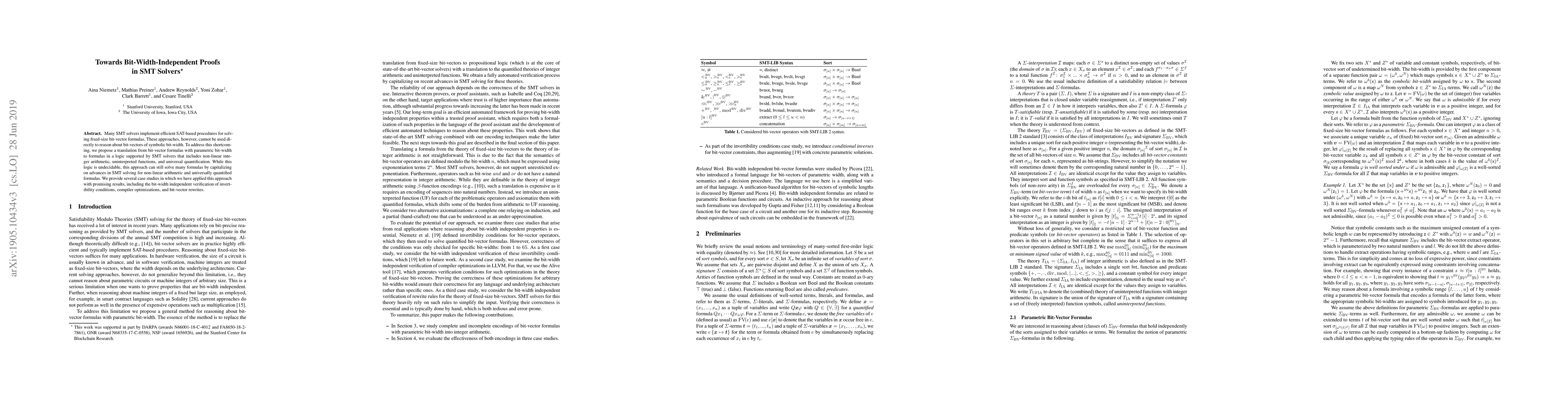 This paper proposes a translation method to enable SMT solvers to handle bit-vectors with symbolic bit-widths by converting them into a decidable logic that includes non-linear integer arithmetic and universal quantification. The approach demonstrates successful application in verifying invertibility, compiler optimizations, and bit-vector rewrites.