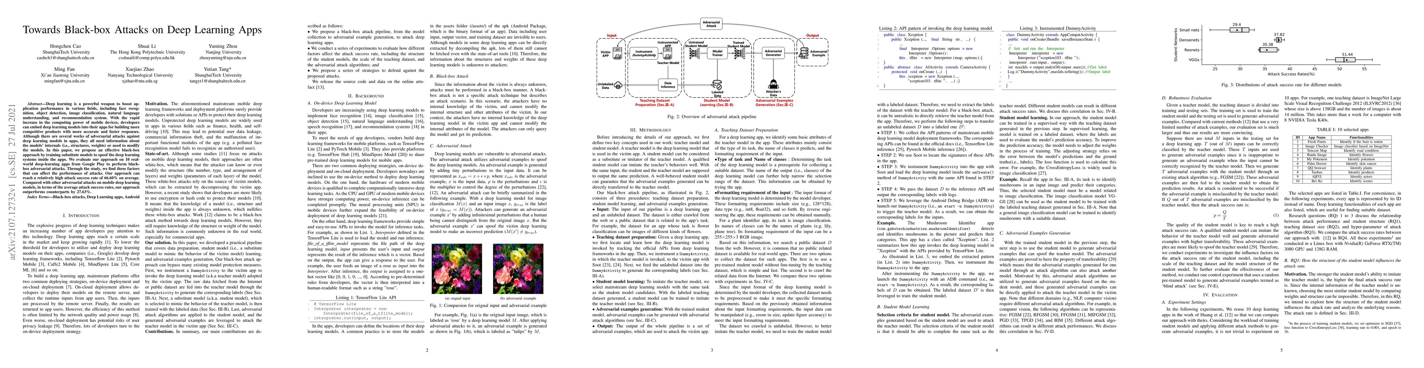 This paper proposes a black-box adversarial attack method for deep learning apps without needing internal model information, by training a substitute model to spoof the system. The approach achieves an average 66.60% success rate on 10 popular apps, outperforming other methods by 27.63%.
