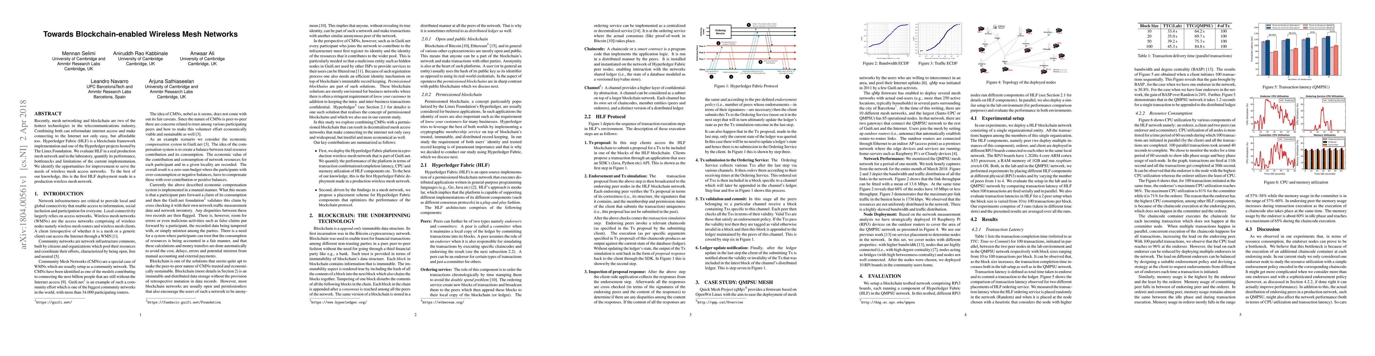 Recently, mesh networking and blockchain are two of the hottest technologies in the telecommunications industry. Combining both can reformulate internet access and make connecting to the Internet not only easy, but affordable too. Hyperledger Fabric (HLF) is a blockchain framework implementation and one of the Hyperledger projects hosted by The Linux Foundation. We evaluate HLF in a real production mesh network and in the laboratory, quantify its performance, bottlenecks and limitations of the current implementation. We identify the opportunities for improvement to serve the needs of wireless mesh access networks. To the best of our knowledge, this is the first HLF deployment made in a production wireless mesh network.