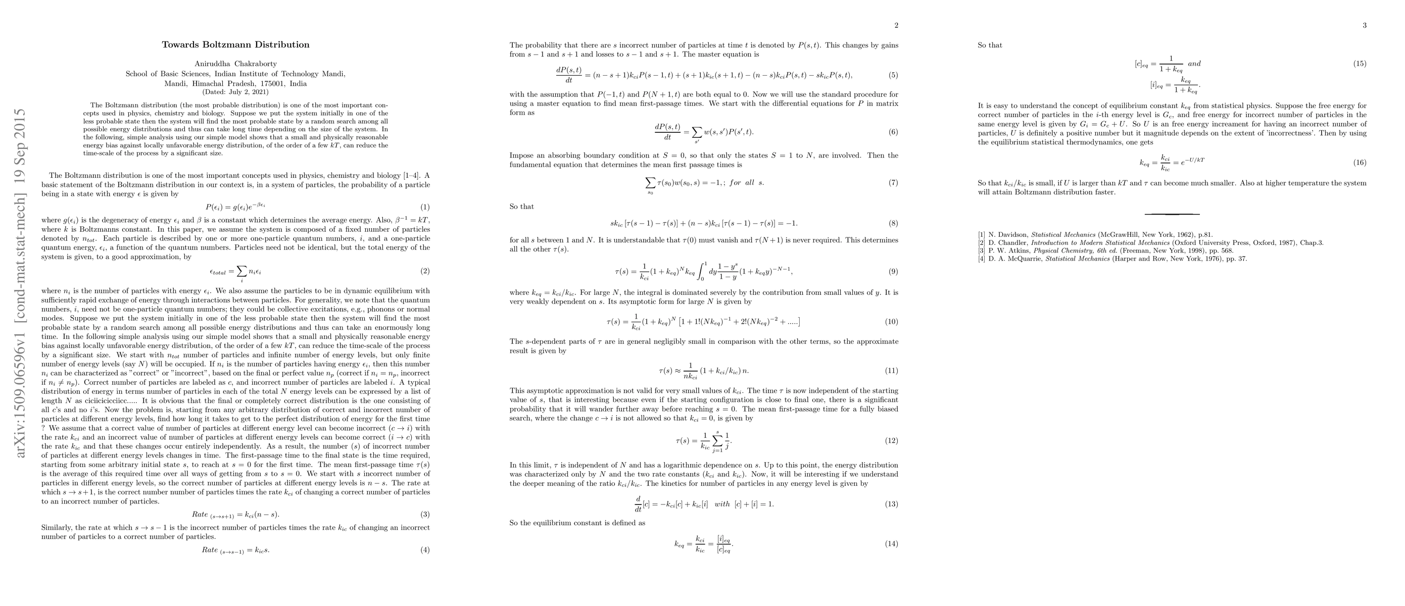 The Boltzmann distribution (the most probable distribution) is one of the most important concepts used in physics, chemistry and biology. Suppose we put the system initially in one of the less probable state then the system will find the most probable state by a random search among all possible energy distributions and thus can take long time depending on the size of the system. In the following, simple analysis using our simple model shows that a small and physically reasonable energy bias against locally unfavorable energy distribution, of the order of a few $kT$, can reduce the time-scale of the process by a significant size.