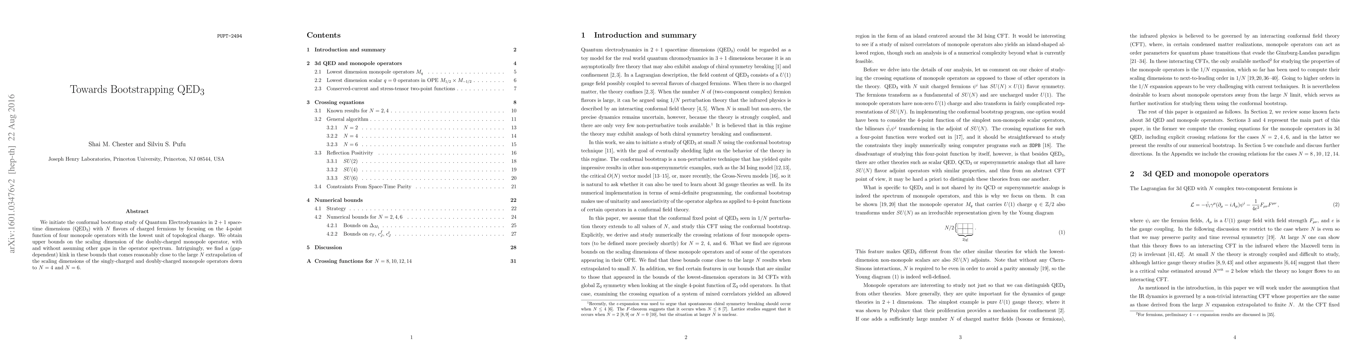 This paper explores Quantum Electrodynamics in 2+1 space-time dimensions using a conformal bootstrap approach, setting upper bounds on monopole operator scaling dimensions and finding intriguing kinks that match large N extrapolations.