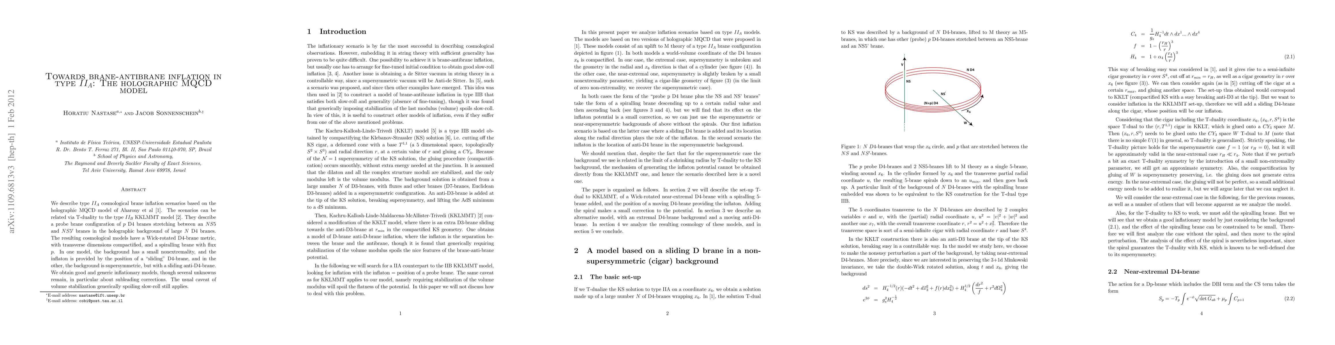 We describe type $II_A$ cosmological brane inflation scenarios based on the holographic MQCD model of Aharony et al \cite{Aharony:2010mi}. The scenarios can be related via T-duality to the type $II_B$ KKLMMT model \cite{Kachru:2003sx}. They describe a probe brane configuration of $p$ D4 branes stretching between an $NS5$ and $NS5'$ branes in the holographic background of large $N$ D4 branes. The resulting cosmological models have a Wick-rotated D4-brane metric, with transverse dimensions compactified, and a spiralling brane with flux $p$. In one model, the background has a small nonextremality, and the inflaton is provided by the position of a "sliding" D4-brane, and in the other, the background is supersymmetric, but with a sliding anti-D4-brane. We obtain good and generic inflationary models, though several unknowns remain, in particular about subleading corrections. The usual caveat of volume stabilization generically spoiling slow-roll still applies.