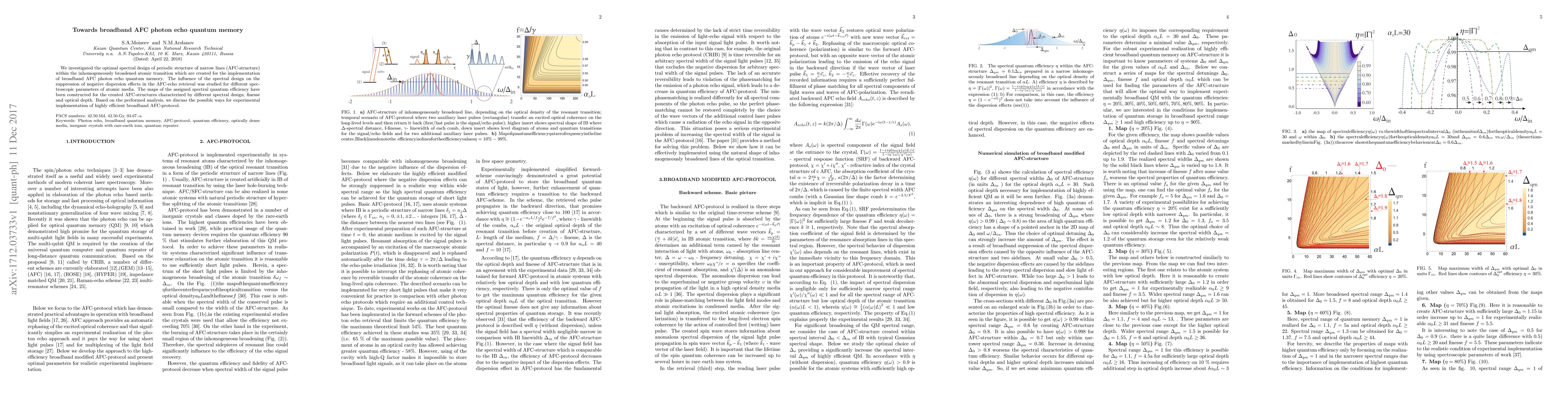 This paper explores the optimal spectral design of AFC-structures for broadband AFC photon echo quantum memory, focusing on suppressing negative dispersion effects. The study constructs spectral quantum efficiency maps for various AFC-structures and discusses potential experimental implementations for efficient broadband quantum memory.
