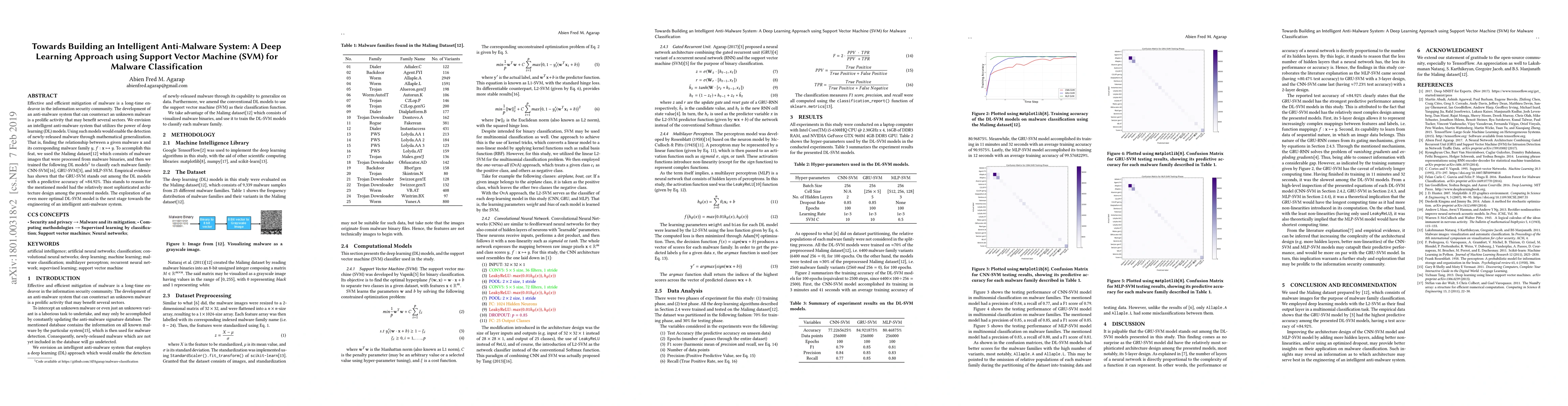 Effective and efficient mitigation of malware is a long-time endeavor in the information security community. The development of an anti-malware system that can counteract an unknown malware is a prolific activity that may benefit several sectors. We envision an intelligent anti-malware system that utilizes the power of deep learning (DL) models. Using such models would enable the detection of newly-released malware through mathematical generalization. That is, finding the relationship between a given malware $x$ and its corresponding malware family $y$, $f: x \mapsto y$. To accomplish this feat, we used the Malimg dataset (Nataraj et al., 2011) which consists of malware images that were processed from malware binaries, and then we trained the following DL models 1 to classify each malware family: CNN-SVM (Tang, 2013), GRU-SVM (Agarap, 2017), and MLP-SVM. Empirical evidence has shown that the GRU-SVM stands out among the DL models with a predictive accuracy of ~84.92%. This stands to reason for the mentioned model had the relatively most sophisticated architecture design among the presented models. The exploration of an even more optimal DL-SVM model is the next stage towards the engineering of an intelligent anti-malware system.