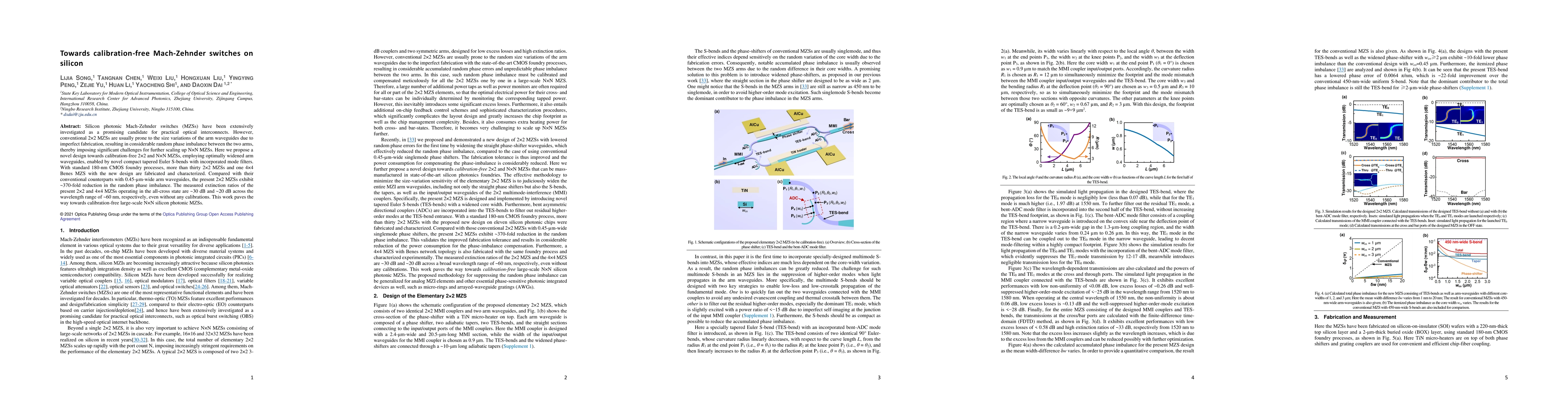 Silicon photonic Mach-Zehnder switches (MZSs) have been extensively investigated as a promising candidate for practical optical interconnects. However, conventional 2{\times}2 MZSs are usually prone to the size variations of the arm waveguides due to imperfect fabrication, resulting in considerable random phase imbalance between the two arms, thereby imposing significant challenges for further scaling up NN MZSs. Here we propose a novel design towards calibration-free 2{\times}2 and N{\times}N MZSs, employing optimally widened arm waveguides, enabled by novel compact tapered Euler S-bends with incorporated mode filters. With standard 180-nm CMOS foundry processes, more than thirty 2{\times}2 MZSs and one 4{\times}4 Benes MZS with the new design are fabricated and characterized. Compared with their conventional counterparts with 0.45-{\mu}m-wide arm waveguides, the present 2{\times}2 MZSs exhibit ~370-fold reduction in the random phase imbalance. The measured extinction ratios of the present 2{\times}2 and 4{\times}4 MZSs operating in the all-cross state are ~30 dB and ~20 dB across the wavelength range of ~60 nm, respectively, even without any calibrations. This work paves the way towards calibration-free large-scale N{\times}N silicon photonic MZSs.