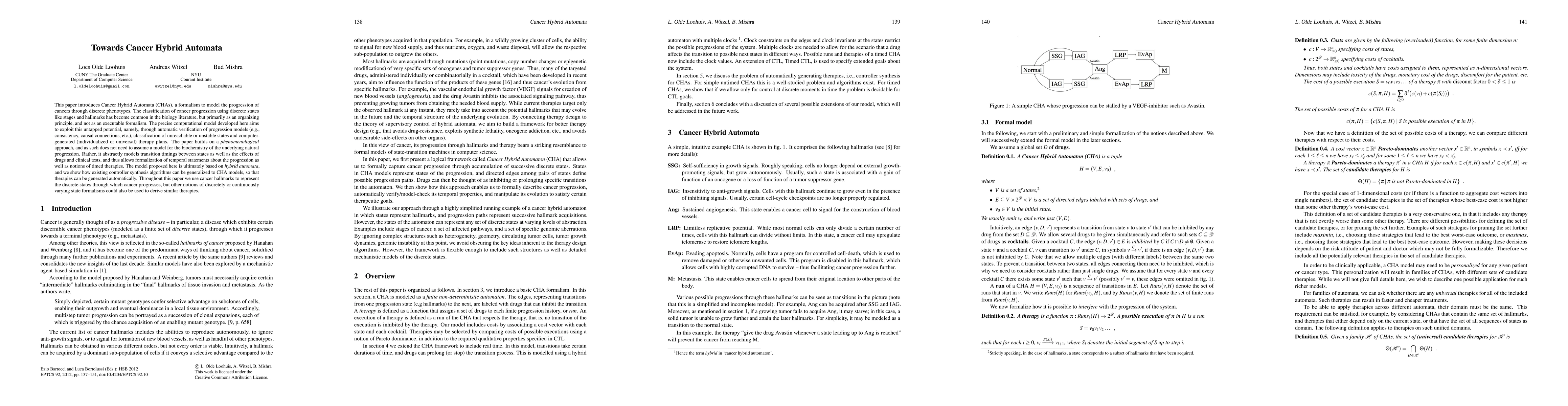 This paper introduces Cancer Hybrid Automata (CHAs) to model cancer progression through discrete phenotypes, enabling automatic verification of progression models and the generation of individualized or universal therapy plans. The formalism leverages hybrid automata to abstractly model transition timings and effects of drugs, allowing for formal temporal statements and timed therapies.