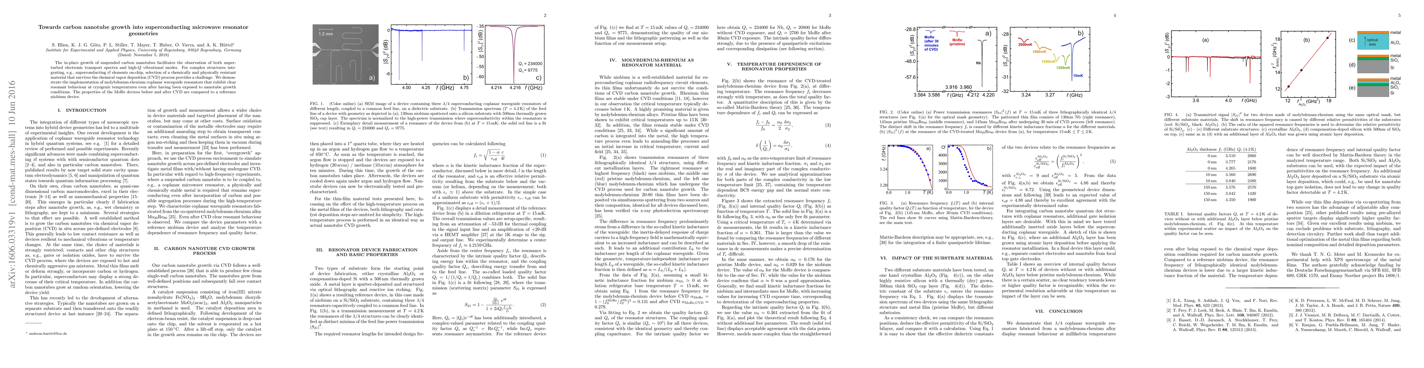 The in-place growth of suspended carbon nanotubes facilitates the observation of both unperturbed electronic transport spectra and high-Q vibrational modes. For complex structures integrating, e.g., superconducting rf elements on-chip, selection of a chemically and physically resistant material that survives the chemical vapor deposition (CVD) process provides a challenge. We demonstrate the implementation of molybdenum-rhenium coplanar waveguide resonators that exhibit clear resonant behaviour at cryogenic temperatures even after having been exposed to nanotube growth conditions. The properties of the MoRe devices before and after CVD are compared to a reference niobium device.