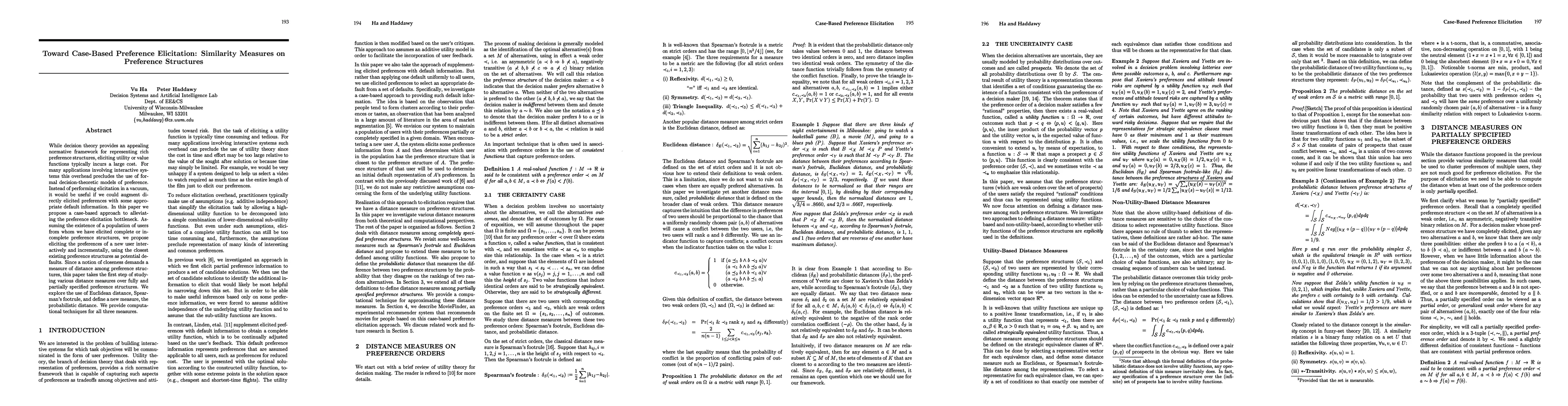 While decision theory provides an appealing normative framework for representing rich preference structures, eliciting utility or value functions typically incurs a large cost. For many applications involving interactive systems this overhead precludes the use of formal decision-theoretic models of preference. Instead of performing elicitation in a vacuum, it would be useful if we could augment directly elicited preferences with some appropriate default information. In this paper we propose a case-based approach to alleviating the preference elicitation bottleneck. Assuming the existence of a population of users from whom we have elicited complete or incomplete preference structures, we propose eliciting the preferences of a new user interactively and incrementally, using the closest existing preference structures as potential defaults. Since a notion of closeness demands a measure of distance among preference structures, this paper takes the first step of studying various distance measures over fully and partially specified preference structures. We explore the use of Euclidean distance, Spearmans footrule, and define a new measure, the probabilistic distance. We provide computational techniques for all three measures.