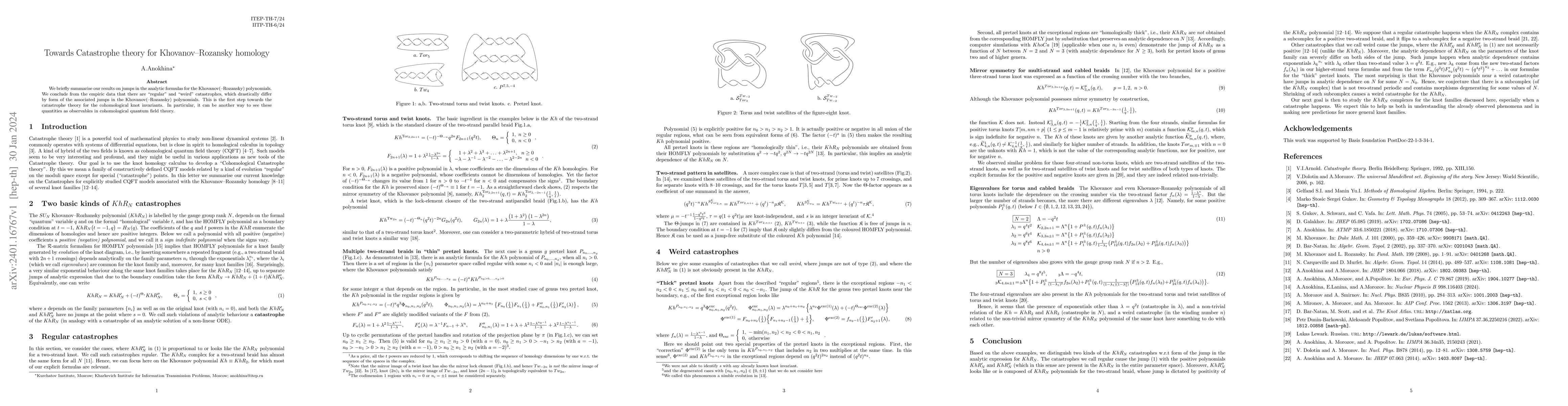 We briefly summarise our results on jumps in the analytic formulas for the Khovanov(-Rozansky) polynomials. We conclude from the empiric data that there are ``regular'' and ``weird'' catastrophes, which drastically differ by form of the associated jumps in the Khovanov(-Rozansky) polynomials. This is the first step towards the catastrophe theory for the cohomological knot invariants. In particular, it can be another way to see these quantities as observables in cohomological quantum field theory.