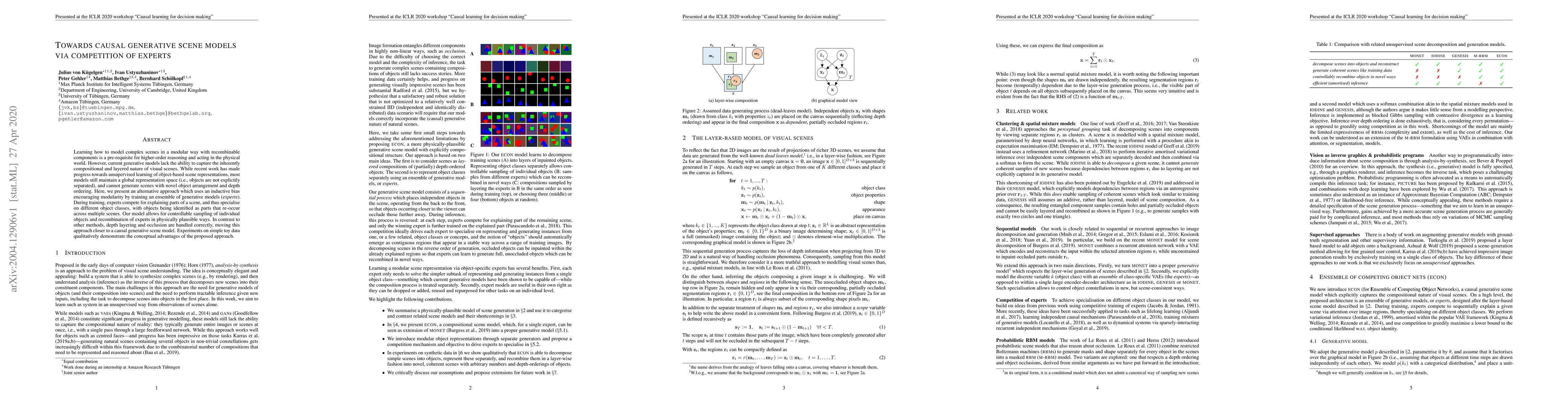 Learning how to model complex scenes in a modular way with recombinable components is a pre-requisite for higher-order reasoning and acting in the physical world. However, current generative models lack the ability to capture the inherently compositional and layered nature of visual scenes. While recent work has made progress towards unsupervised learning of object-based scene representations, most models still maintain a global representation space (i.e., objects are not explicitly separated), and cannot generate scenes with novel object arrangement and depth ordering. Here, we present an alternative approach which uses an inductive bias encouraging modularity by training an ensemble of generative models (experts). During training, experts compete for explaining parts of a scene, and thus specialise on different object classes, with objects being identified as parts that re-occur across multiple scenes. Our model allows for controllable sampling of individual objects and recombination of experts in physically plausible ways. In contrast to other methods, depth layering and occlusion are handled correctly, moving this approach closer to a causal generative scene model. Experiments on simple toy data qualitatively demonstrate the conceptual advantages of the proposed approach.