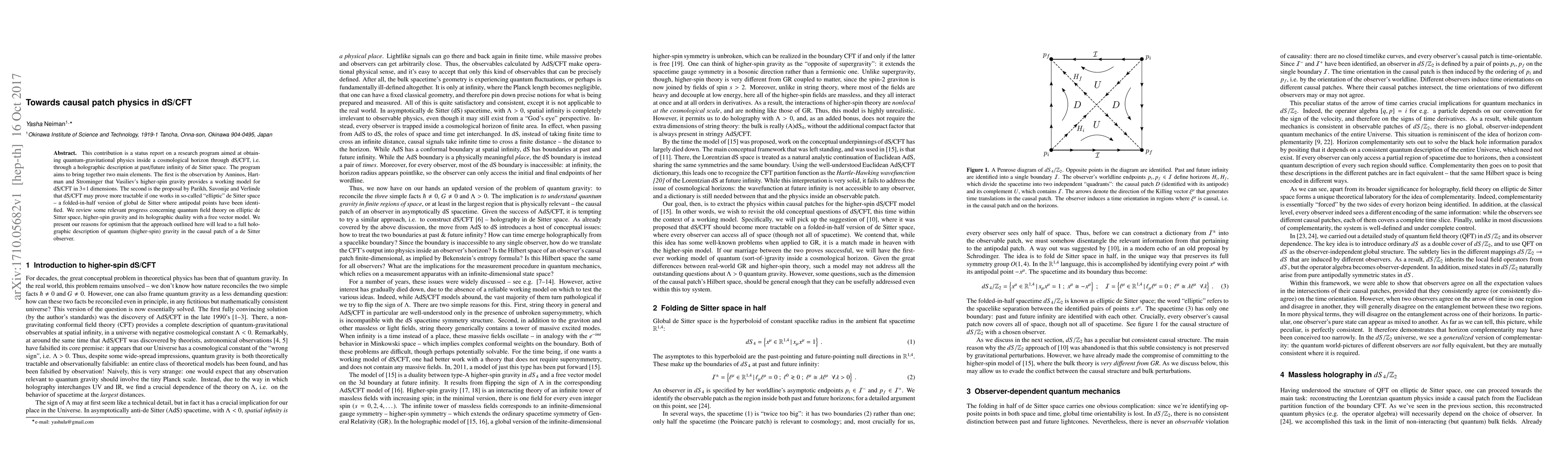 This is a status report on a research program aimed at obtaining quantum-gravitational physics inside a cosmological horizon through dS/CFT, i.e. through a holographic description at past/future infinity of de Sitter space. The program aims to bring together two main elements. The first is the observation by Anninos, Hartman and Strominger that Vasiliev's higher-spin gravity provides a working model for dS/CFT in 3+1 dimensions. The second is the proposal by Parikh, Savonije and Verlinde that dS/CFT may prove more tractable if one works in so-called "elliptic" de Sitter space - a folded-in-half version of global de Sitter where antipodal points have been identified. We review some relevant progress concerning quantum field theory on elliptic de Sitter space, higher-spin gravity and its holographic duality with a free vector model. We present our reasons for optimism that the approach outlined here will lead to a full holographic description of quantum (higher-spin) gravity in the causal patch of a de Sitter observer.