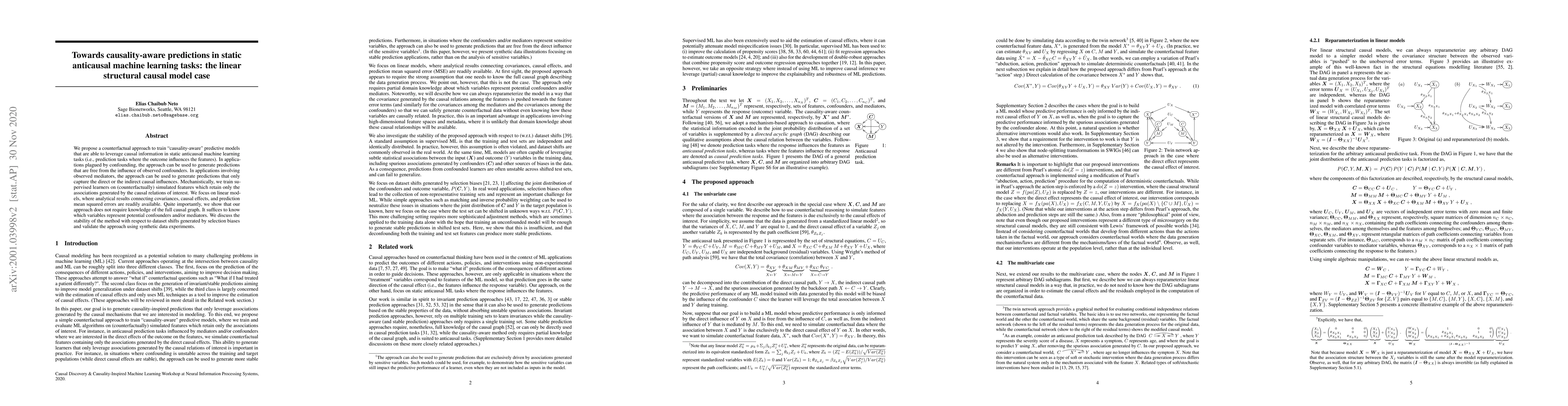 We propose a counterfactual approach to train ``causality-aware" predictive models that are able to leverage causal information in static anticausal machine learning tasks (i.e., prediction tasks where the outcome influences the features). In applications plagued by confounding, the approach can be used to generate predictions that are free from the influence of observed confounders. In applications involving observed mediators, the approach can be used to generate predictions that only capture the direct or the indirect causal influences. Mechanistically, we train supervised learners on (counterfactually) simulated features which retain only the associations generated by the causal relations of interest. We focus on linear models, where analytical results connecting covariances, causal effects, and prediction mean squared errors are readily available. Quite importantly, we show that our approach does not require knowledge of the full causal graph. It suffices to know which variables represent potential confounders and/or mediators. We discuss the stability of the method with respect to dataset shifts generated by selection biases and validate the approach using synthetic data experiments.
