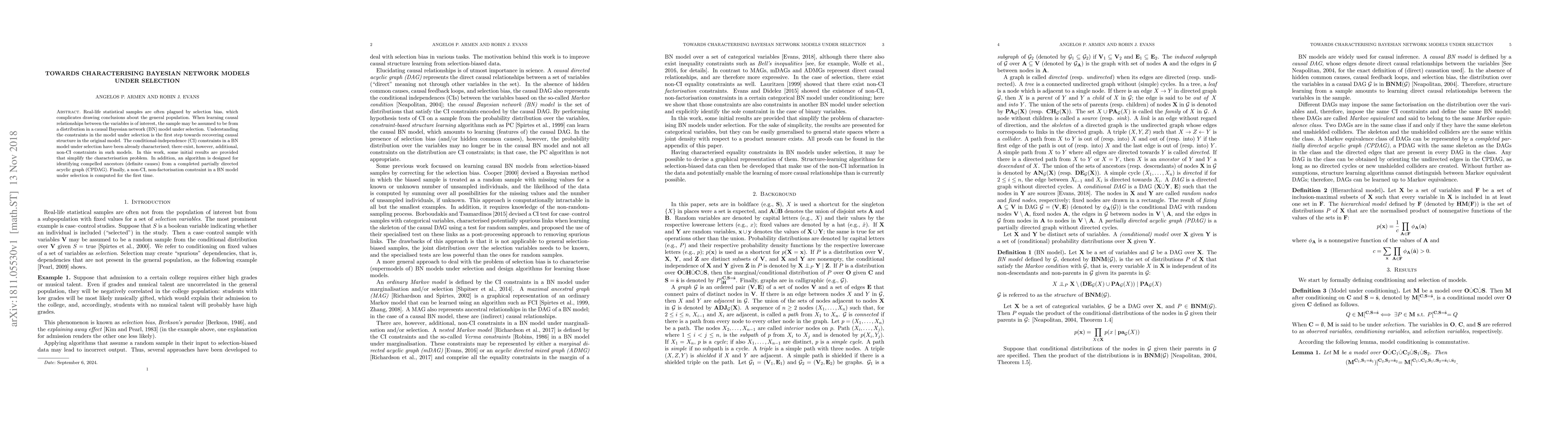 Real-life statistical samples are often plagued by selection bias, which complicates drawing conclusions about the general population. When learning causal relationships between the variables is of interest, the sample may be assumed to be from a distribution in a causal Bayesian network (BN) model under selection. Understanding the constraints in the model under selection is the first step towards recovering causal structure in the original model. The conditional-independence (CI) constraints in a BN model under selection have been already characterised; there exist, however, additional, non-CI constraints in such models. In this work, some initial results are provided that simplify the characterisation problem. In addition, an algorithm is designed for identifying compelled ancestors (definite causes) from a completed partially directed acyclic graph (CPDAG). Finally, a non-CI, non-factorisation constraint in a BN model under selection is computed for the first time.