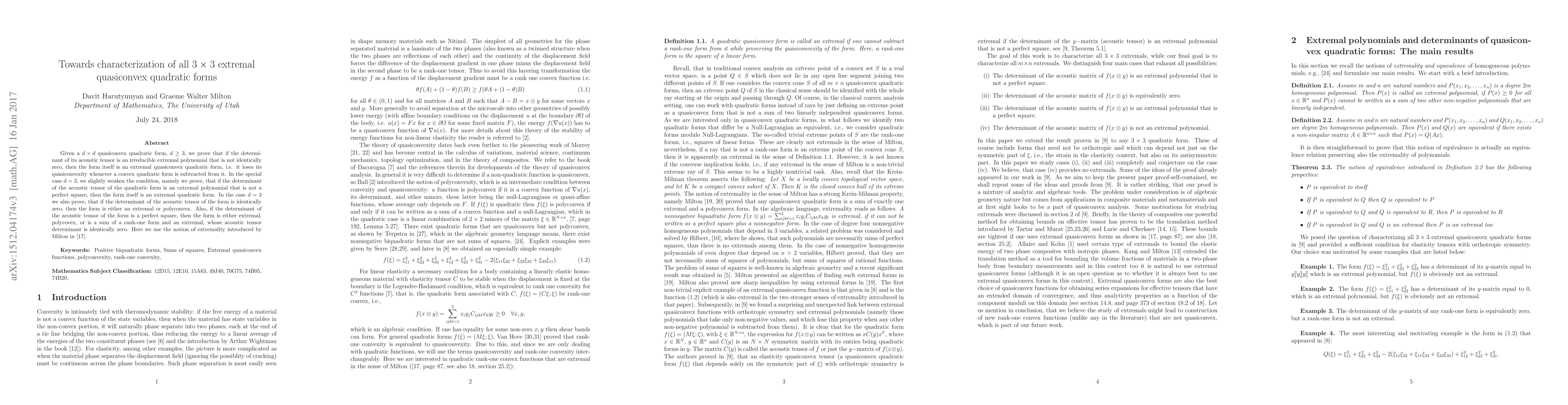 Given a $d\times d$ quasiconvex quadratic form, $d\geq 3,$ we prove that if the determinant of its acoustic tensor is an irreducible extremal polynomial that is not identically zero, then the form itself is an extremal quasiconvex quadratic form, i.e. it loses its quasiconvexity whenever a convex quadratic form is subtracted from it. In the special case $d=3,$ we slightly weaken the condition, namely we prove, that if the determinant of the acoustic tensor of the quadratic form is an extremal polynomial that is not a perfect square, then the form itself is an extremal quadratic form. In the case $d=3$ we also prove, that if the determinant of the acoustic tensor of the form is identically zero, then the form is either an extremal or polyconvex. Also, if the determinant of the acoustic tensor of the form is a perfect square, then the form is either extremal, polycovex, or is a sum of a rank-one form and an extremal, whose acoustic tensor determinant is identically zero. Here we use the notion of extremality introduced by Milton in [\ref{bib:Mil3}]