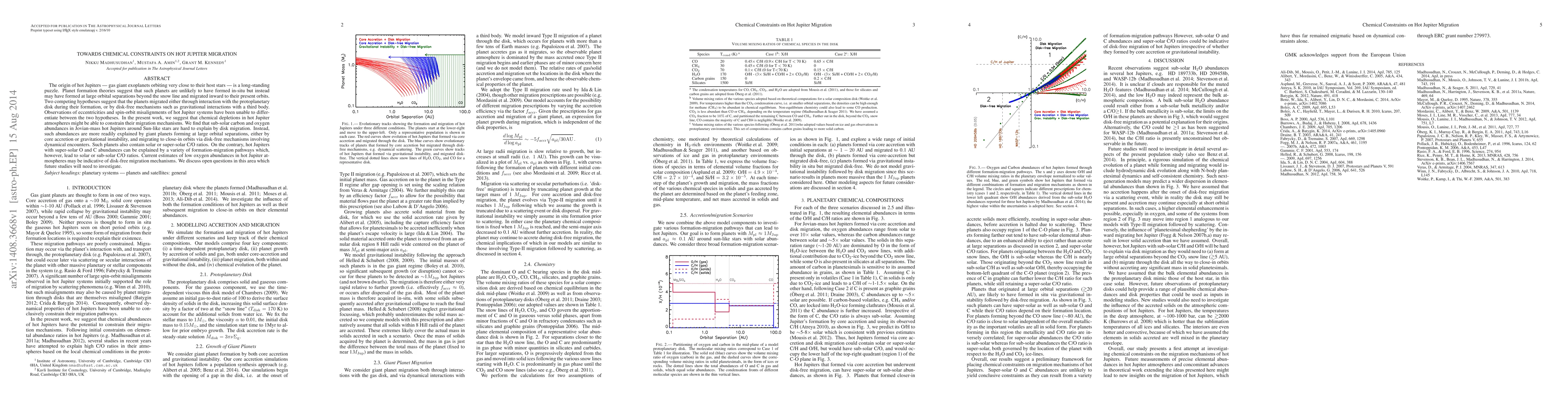 This paper explores the migration mechanisms of hot Jupiters by analyzing chemical depletions in their atmospheres, suggesting that sub-solar carbon and oxygen abundances favor disk-free migration rather than disk migration. It posits that low oxygen abundances may indicate migration via dynamical encounters, while super-solar abundances allow for a variety of migration pathways.