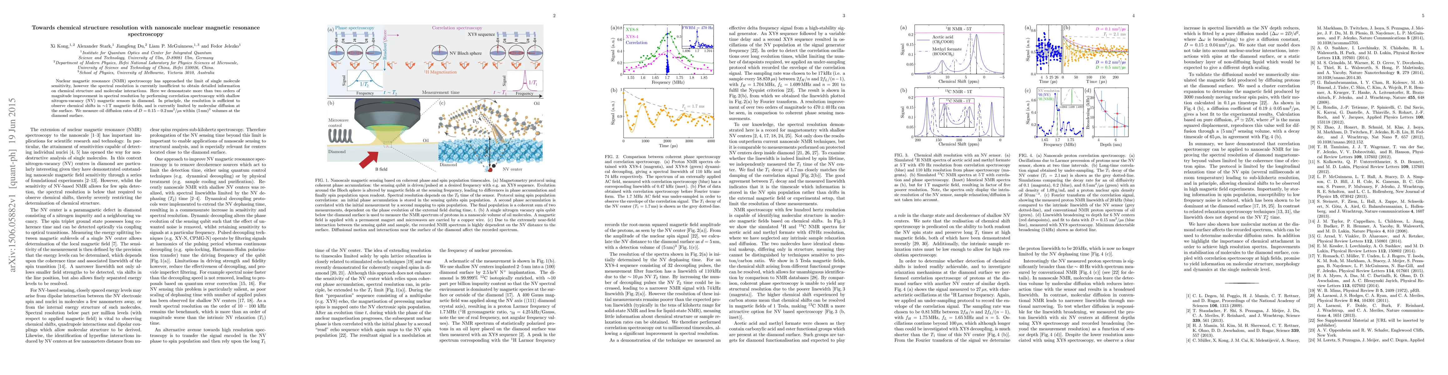 This paper demonstrates a significant enhancement in spectral resolution for nanoscale nuclear magnetic resonance (NMR) spectroscopy using shallow nitrogen-vacancy (NV) magnetic sensors in diamond, potentially allowing for detailed chemical structure resolution. The current resolution is limited by molecular diffusion at the surface, with measured diffusion rates of $D = 0.15 - 0.2$ nm$^2/\mathrm{\mu}$s within (5 nm)$^3$ volumes.