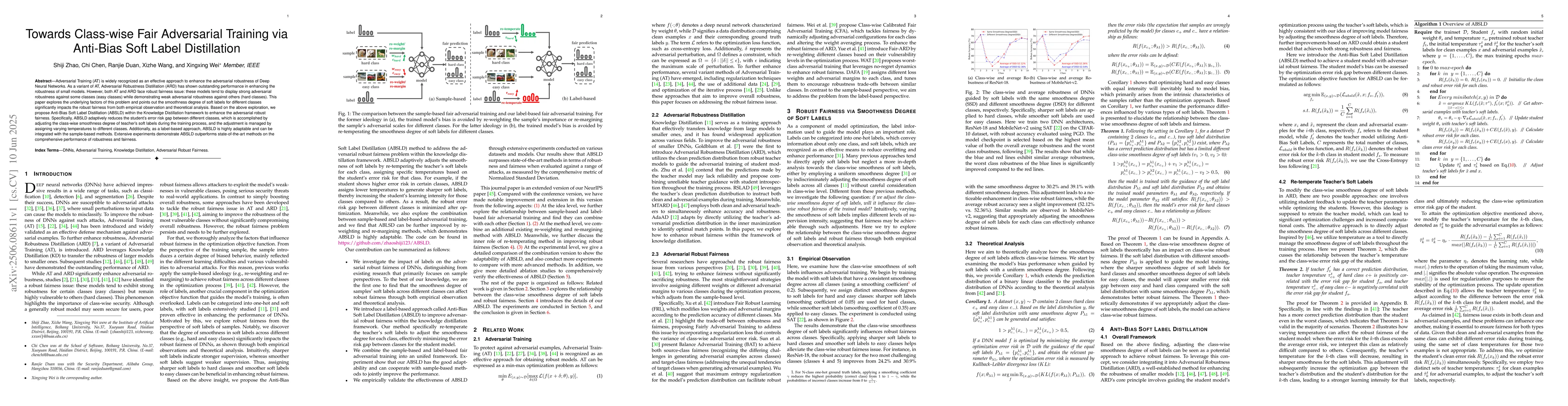 A new method called Anti-Bias Soft Label Distillation (ABSLD) is proposed to improve fairness in adversarial training of deep neural networks, reducing error risk gaps between classes by adjusting soft label smoothness degrees.