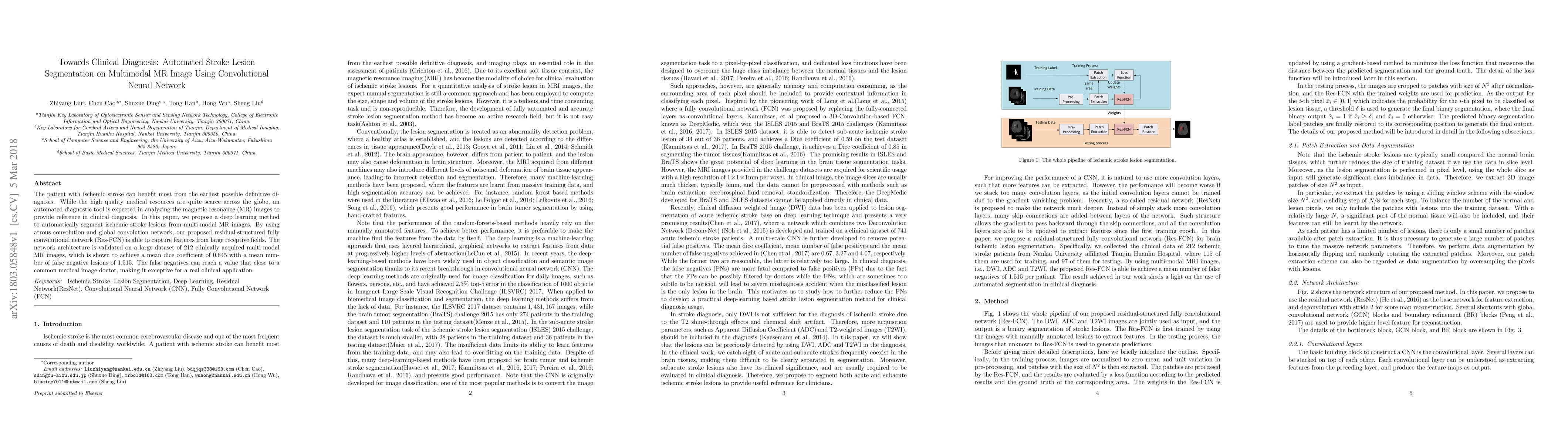 This paper proposes a deep learning method using a residual-structured fully convolutional network (Res-FCN) to automatically segment ischemic stroke lesions from multi-modal MR images. The method achieves a mean dice coefficient of 0.645, demonstrating its potential for aiding clinical diagnosis despite limited medical resources.