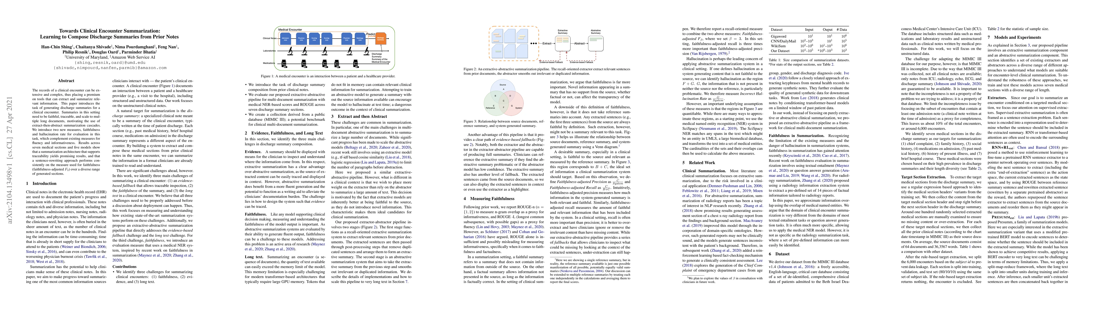 This paper explores generating discharge summaries from extensive clinical encounter records using extract-then-abstract summarization. It introduces new evaluation metrics for faithfulness and hallucination rate, alongside existing measures, and finds that a summarization architecture supporting traceability and a sentence-rewriting approach yield promising results.