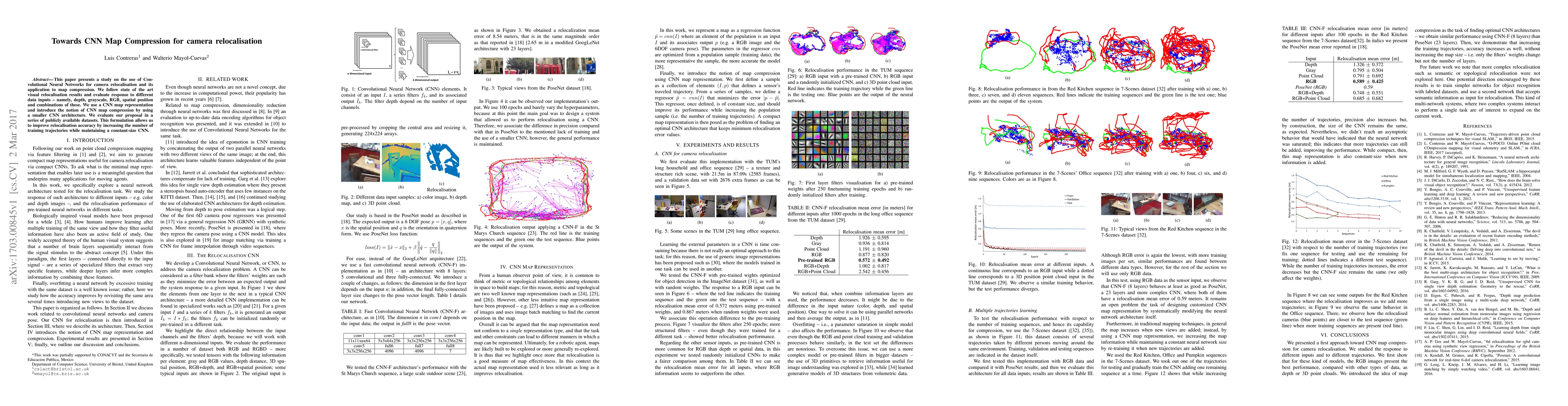 This paper explores using Convolutional Neural Networks (CNNs) for camera relocalisation and proposes CNN map compression to enhance accuracy while maintaining a constant-size CNN through a smaller architecture. The study evaluates various data inputs and assesses performance across multiple datasets.