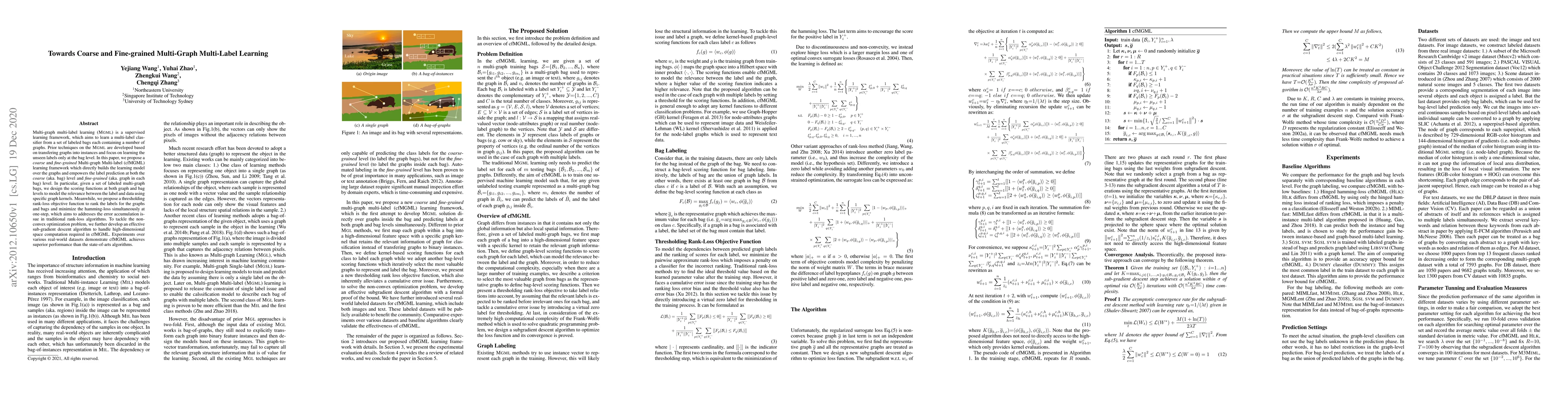 Multi-graph multi-label learning (\textsc{Mgml}) is a supervised learning framework, which aims to learn a multi-label classifier from a set of labeled bags each containing a number of graphs. Prior techniques on the \textsc{Mgml} are developed based on transfering graphs into instances and focus on learning the unseen labels only at the bag level. In this paper, we propose a \textit{coarse} and \textit{fine-grained} Multi-graph Multi-label (cfMGML) learning framework which directly builds the learning model over the graphs and empowers the label prediction at both the \textit{coarse} (aka. bag) level and \textit{fine-grained} (aka. graph in each bag) level. In particular, given a set of labeled multi-graph bags, we design the scoring functions at both graph and bag levels to model the relevance between the label and data using specific graph kernels. Meanwhile, we propose a thresholding rank-loss objective function to rank the labels for the graphs and bags and minimize the hamming-loss simultaneously at one-step, which aims to addresses the error accumulation issue in traditional rank-loss algorithms. To tackle the non-convex optimization problem, we further develop an effective sub-gradient descent algorithm to handle high-dimensional space computation required in cfMGML. Experiments over various real-world datasets demonstrate cfMGML achieves superior performance than the state-of-arts algorithms.