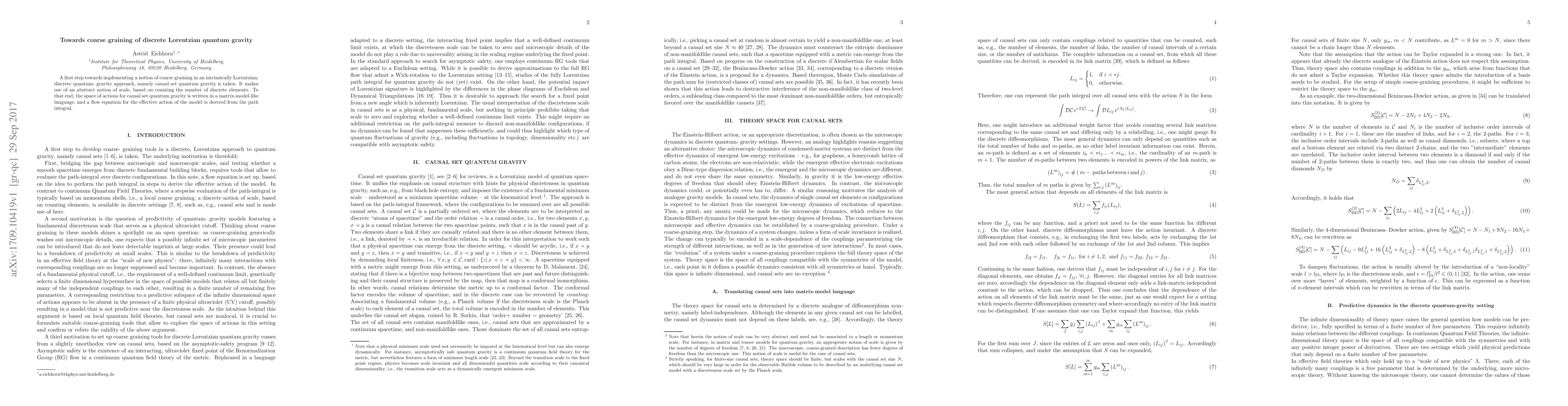 This paper introduces a method for coarse graining in causal set quantum gravity, employing a discrete elements count as an abstract scale, and derives a flow equation for the effective action using a matrix-model-like representation of the space of actions.