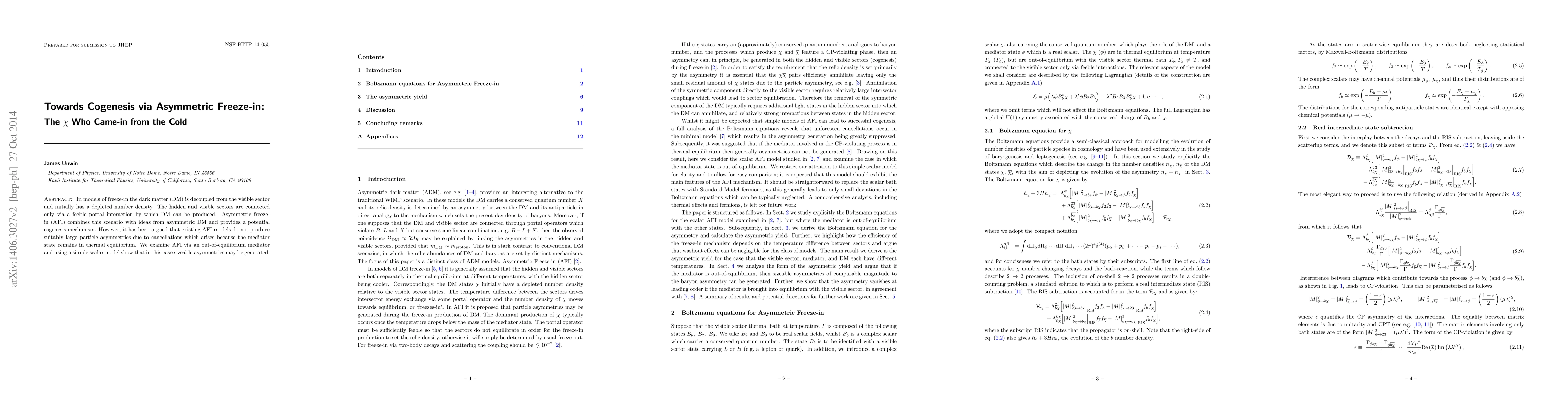 This paper explores asymmetric freeze-in (AFI) as a mechanism for cogenesis, where dark matter and baryon asymmetries could be generated simultaneously. It proposes an out-of-equilibrium mediator to bypass thermal equilibrium cancellations, demonstrating that this approach can produce significant particle asymmetries.