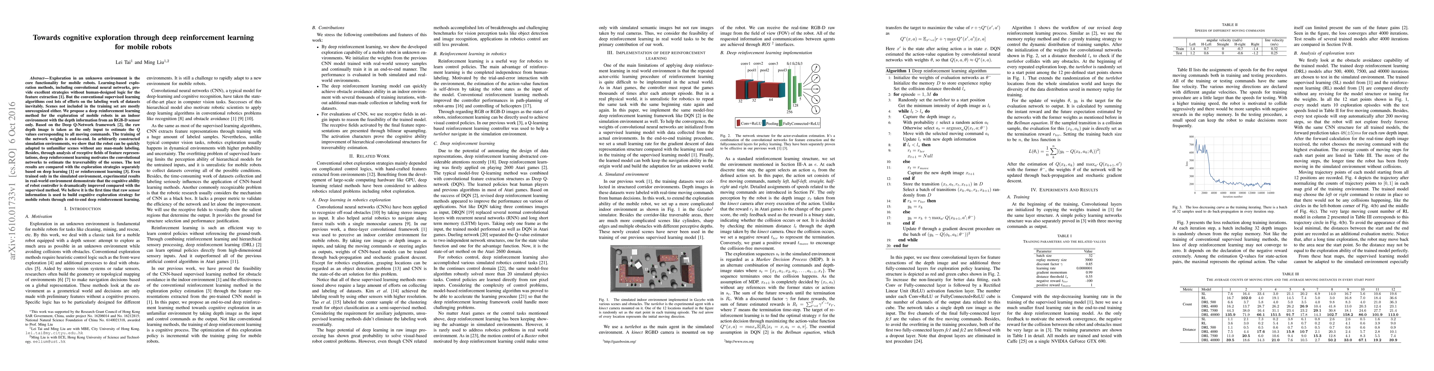 This paper proposes a deep reinforcement learning method for mobile robot exploration in unknown indoor environments using only raw depth data from an RGB-D sensor. The Deep Q-Network framework enables the robot to adapt to unfamiliar scenes without human-labeled datasets, significantly improving cognitive exploration capabilities compared to supervised learning methods.