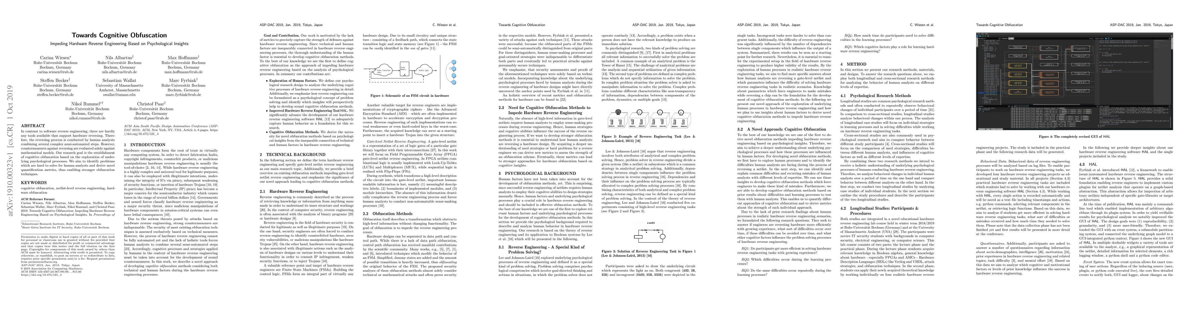 In contrast to software reverse engineering, there are hardly any tools available that support hardware reversing. Therefore, the reversing process is conducted by human analysts combining several complex semi-automated steps. However, countermeasures against reversing are evaluated solely against mathematical models. Our research goal is the establishment of cognitive obfuscation based on the exploration of underlying psychological processes. We aim to identify problems which are hard to solve for human analysts and derive novel quantification metrics, thus enabling stronger obfuscation techniques.