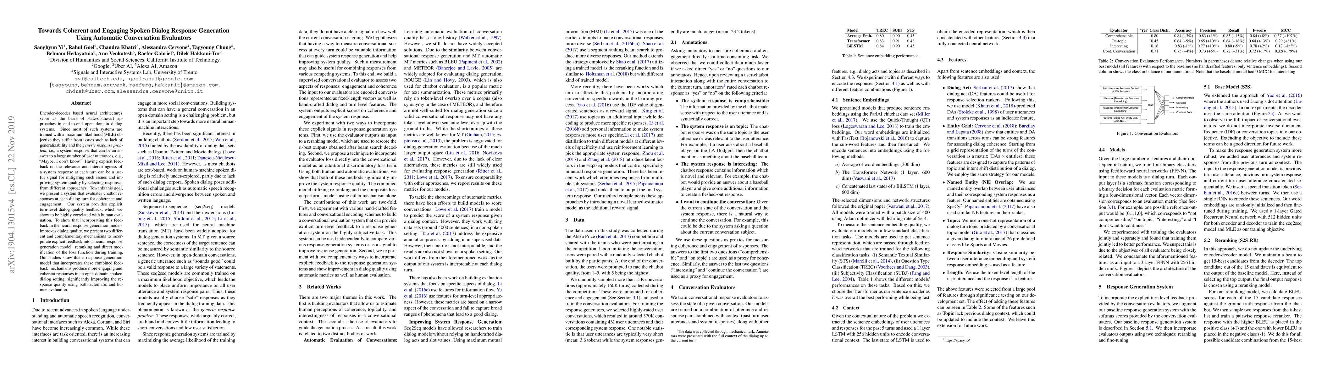 This paper proposes a system to evaluate chatbot responses for coherence and engagement using automatic conversation evaluators. It demonstrates that incorporating explicit feedback into neural response generation models through reranking and loss function modification significantly enhances response quality, improving both automatic and human evaluations of dialog quality.