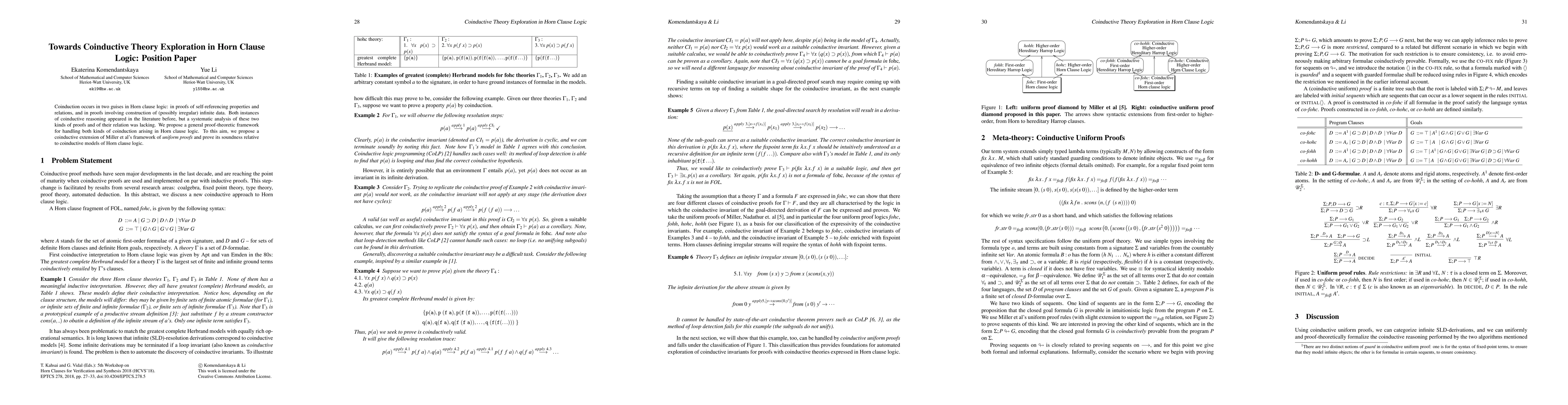 Coinduction occurs in two guises in Horn clause logic: in proofs of self-referencing properties and relations, and in proofs involving construction of (possibly irregular) infinite data. Both instances of coinductive reasoning appeared in the literature before, but a systematic analysis of these two kinds of proofs and of their relation was lacking. We propose a general proof-theoretic framework for handling both kinds of coinduction arising in Horn clause logic. To this aim, we propose a coinductive extension of Miller et al's framework of uniform proofs and prove its soundness relative to coinductive models of Horn clause logic.