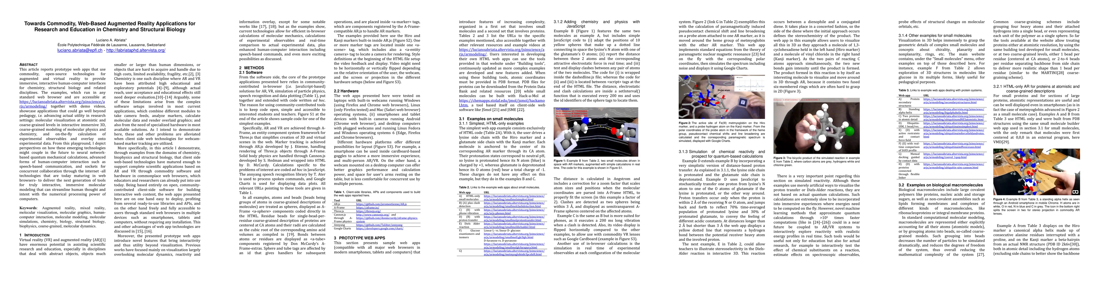 This paper presents web-based augmented reality applications using open-source technologies for chemistry and structural biology, offering immersive, interactive interfaces. The prototypes aim to advance research and education by enabling molecular visualization and modeling, with potential future integration of neural networks and advanced human-computer interaction.