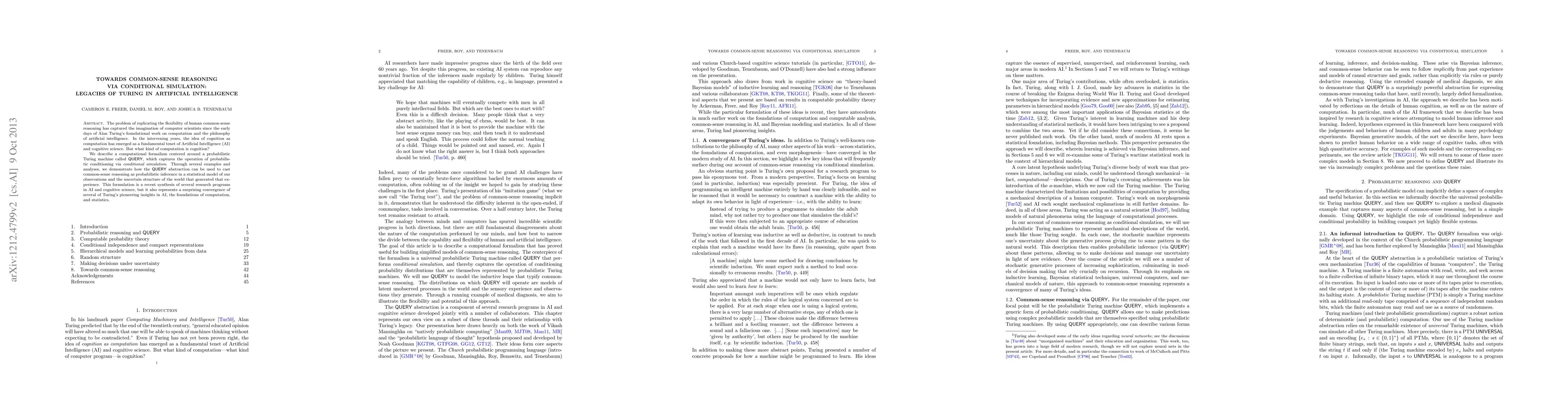 This paper proposes a computational model called QUERY, based on probabilistic Turing machines and conditional simulation, to replicate human common-sense reasoning through probabilistic inference. It highlights the convergence of Turing's foundational ideas in AI and statistics with modern AI research.
