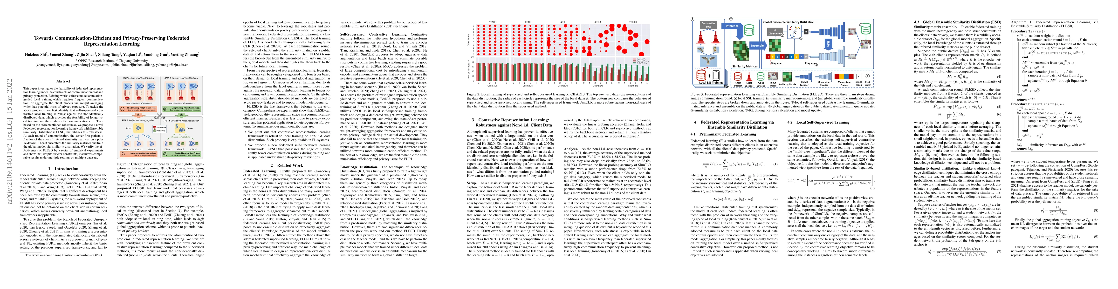 This paper proposes a novel Federated representation Learning framework with Ensemble Similarity Distillation (FLESD) to achieve communication-efficient and privacy-preserving federated learning. FLESD leverages self-supervised contrastive local training to reduce communication costs and employs ensemble similarity distillation to mitigate privacy risks.