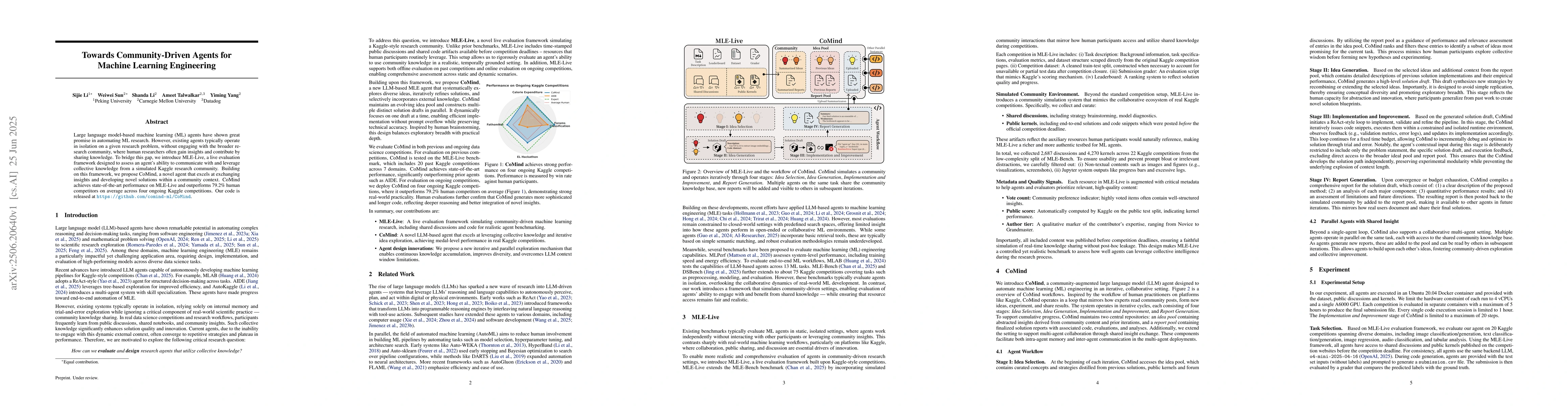 Large language model-based machine learning (ML) agents have shown great promise in automating ML research. However, existing agents typically operate in isolation on a given research problem, without engaging with the broader research community, where human researchers often gain insights and contribute by sharing knowledge. To bridge this gap, we introduce MLE-Live, a live evaluation framework designed to assess an agent's ability to communicate with and leverage collective knowledge from a simulated Kaggle research community. Building on this framework, we propose CoMind, a novel agent that excels at exchanging insights and developing novel solutions within a community context. CoMind achieves state-of-the-art performance on MLE-Live and outperforms 79.2% human competitors on average across four ongoing Kaggle competitions. Our code is released at https://github.com/comind-ml/CoMind.