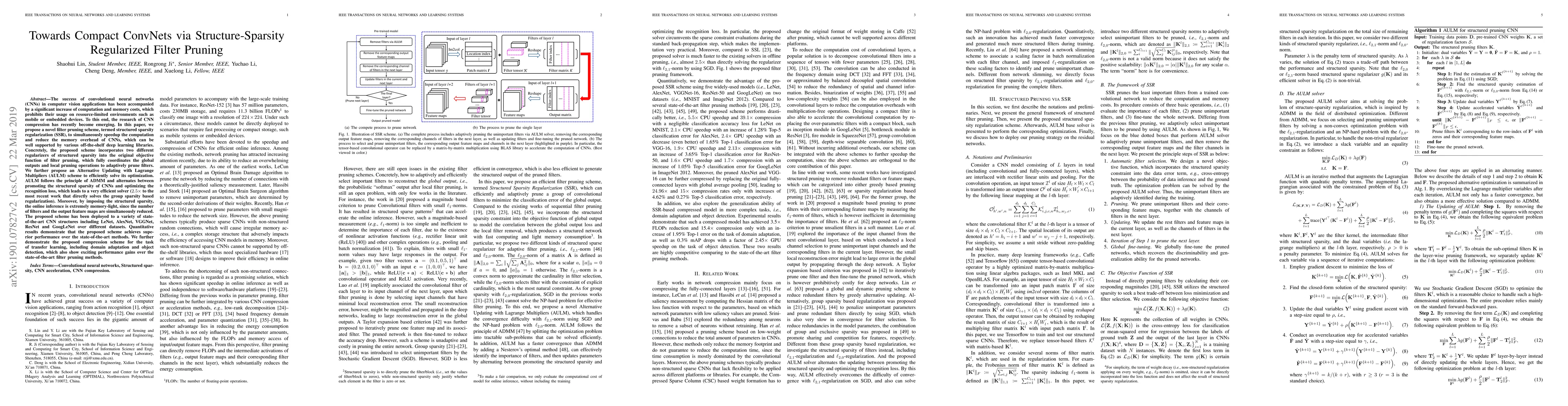This paper proposes a novel structured sparsity regularization (SSR) filter pruning scheme to compress CNNs, achieving faster computation and lower memory usage. The SSR method incorporates two regularizers into the pruning objective, and an AULM solver optimizes the structured sparsity efficiently, leading to superior performance across various CNN architectures.