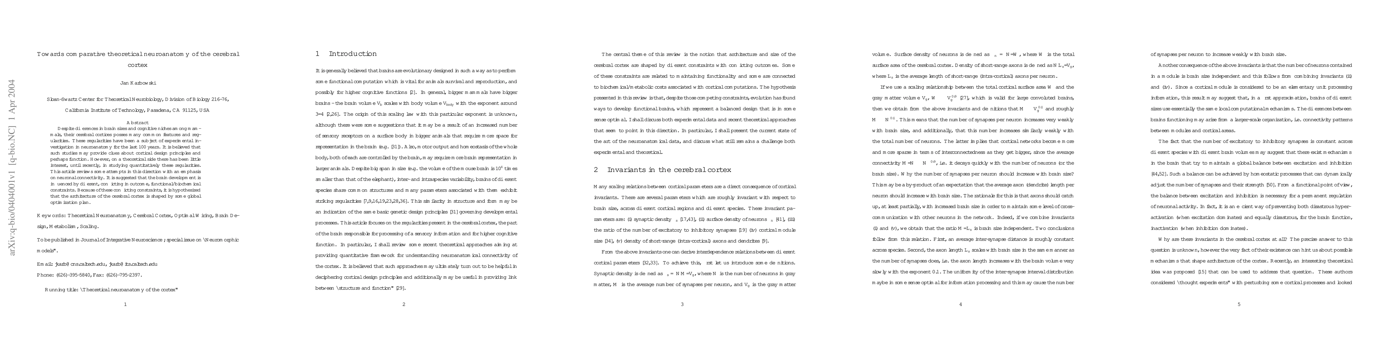 This paper reviews theoretical approaches to understanding the common features of mammalian cerebral cortices, focusing on neuronal connectivity and the influence of conflicting functional/biochemical constraints. It hypothesizes that the cerebral cortex's architecture is shaped by a global optimization plan due to these constraints.