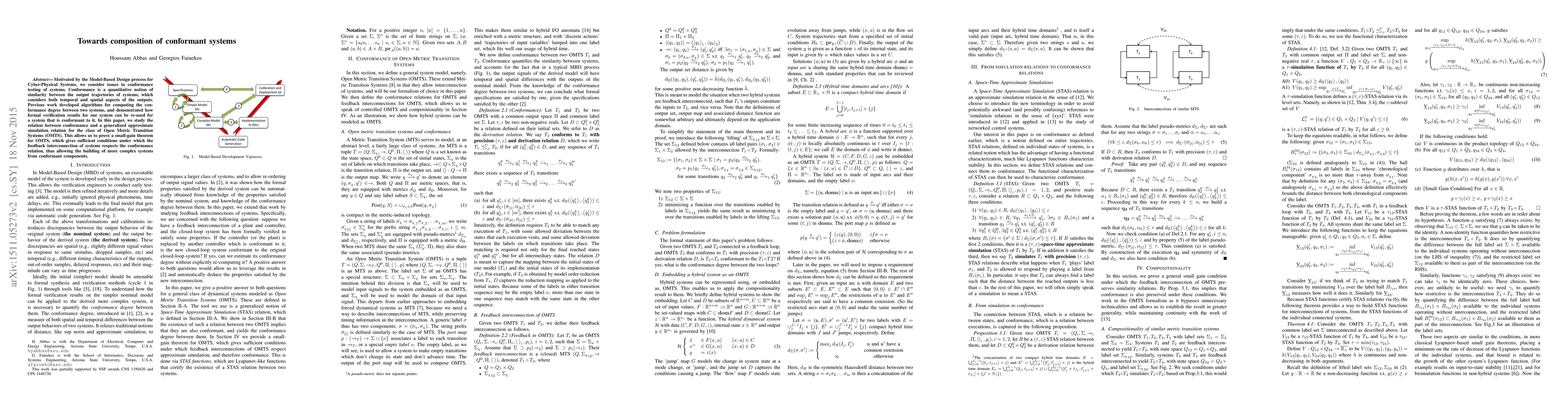 Motivated by the Model-Based Design process for Cyber-Physical Systems, we consider issues in conformance testing of systems. Conformance is a quantitative notion of similarity between the output trajectories of systems, which considers both temporal and spatial aspects of the outputs. Previous work developed algorithms for computing the conformance degree between two systems, and demonstrated how formal verification results for one system can be re-used for a system that is conformant to it. In this paper, we study the relation between conformance and a generalized approximate simulation relation for the class of Open Metric Transition Systems (OMTS). This allows us to prove a small-gain theorem for OMTS, which gives sufficient conditions under which the feedback interconnection of systems respects the conformance relation, thus allowing the building of more complex systems from conformant components.